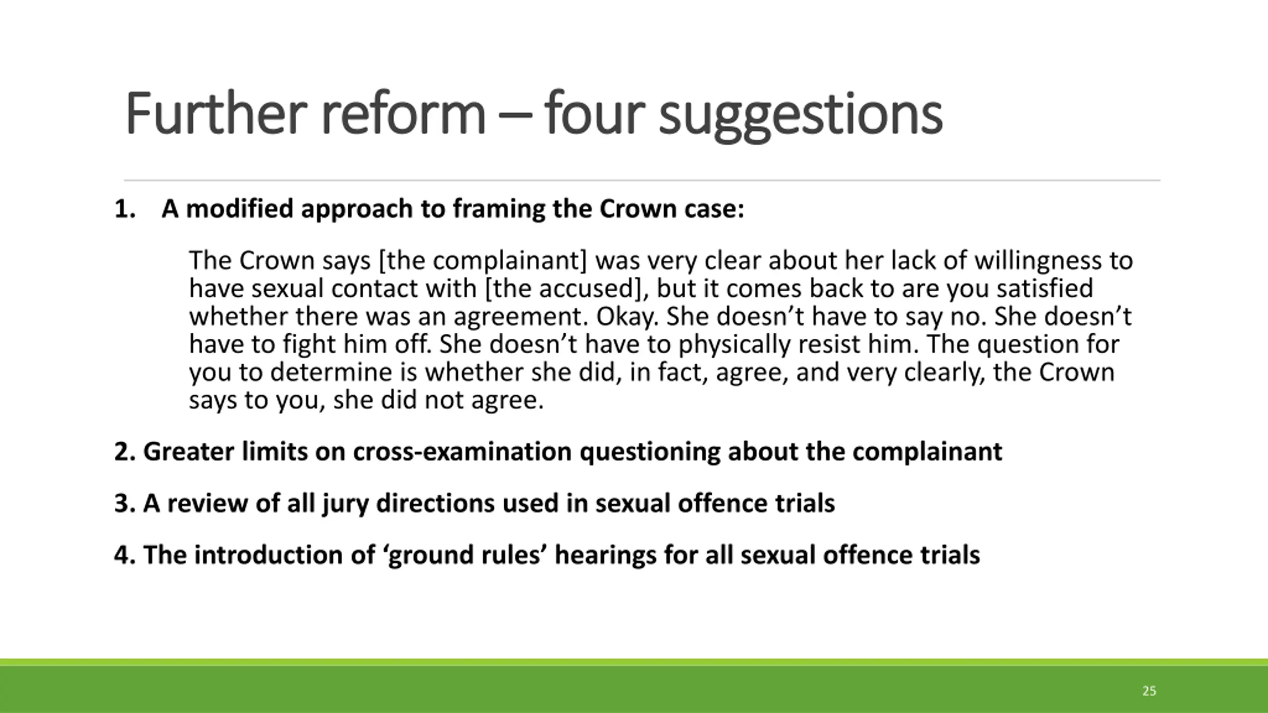 Further reform Further reform four suggestions four suggestions 1. A modified approach to framing the Crown case: The Crown says [the complainant] was very clear about her lack of willingness to have sexual contact with [the accused], but it comes back to are you satisfied whether there was an agreement. Okay. She doesn t have to say no. She doesn t have to fight him off. She doesn t have to physically resist him. The question for you to determine is whether she did, in fact, agree, and very clearly, the Crown says to you, she did not agree. 2. Greater limits on cross-examination questioning about the complainant 3. A review of all jury directions used in sexual offence trials 4. The introduction of ground rules hearings for all sexual offence trials 25