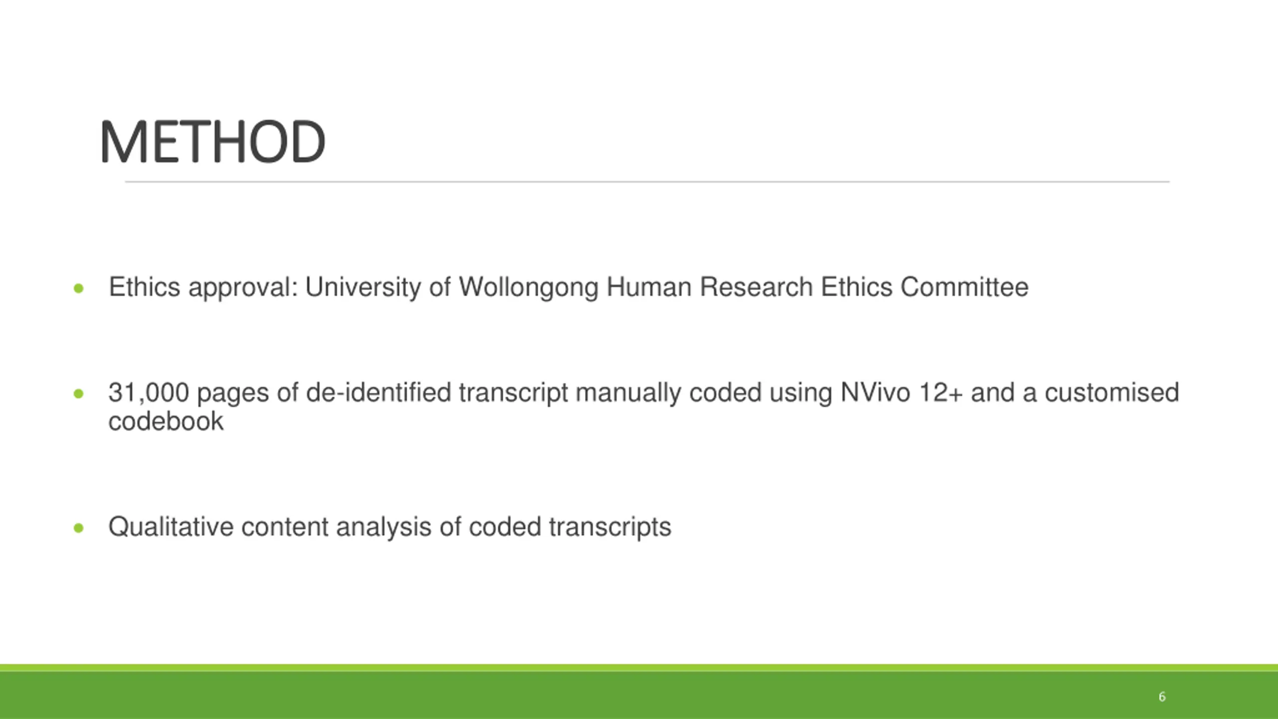 METHOD METHOD Ethics approval: University of Wollongong Human Research Ethics Committee 31,000 pages of de-identified transcript manually coded using NVivo 12+ and a customised codebook Qualitative content analysis of coded transcripts 6