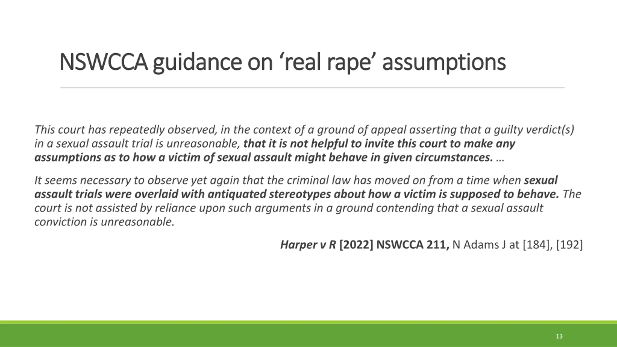 NSWCCA guidance on real rape assumptions NSWCCA guidance on real rape assumptions This court has repeatedly observed, in the context of a ground of appeal asserting that a guilty verdict(s) in a sexual assault trial is unreasonable, that it is not helpful to invite this court to make any assumptions as to how a victim of sexual assault might behave in given circumstances. It seems necessary to observe yet again that the criminal law has moved on from a time when sexual assault trials were overlaid with antiquated stereotypes about how a victim is supposed to behave. The court is not assisted by reliance upon such arguments in a ground contending that a sexual assault conviction is unreasonable. Harper v R [2022] NSWCCA 211, N Adams J at [184], [192] 13