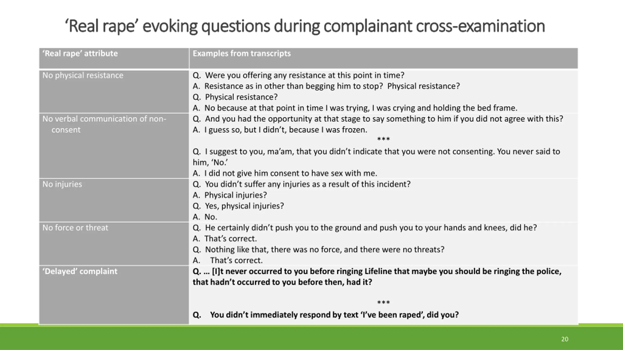 Real rape evoking questions during complainant cross Real rape evoking questions during complainant cross- -examination examination Real rape attribute Examples from transcripts No physical resistance Q. Were you offering any resistance at this point in time? A. Resistance as in other than begging him to stop? Physical resistance? Q. Physical resistance? A. No because at that point in time I was trying, I was crying and holding the bed frame. Q. And you had the opportunity at that stage to say something to him if you did not agree with this? A. I guess so, but I didn t, because I was frozen. *** Q. I suggest to you, ma am, that you didn t indicate that you were not consenting. You never said to him, No. A. I did not give him consent to have sex with me. Q. You didn t suffer any injuries as a result of this incident? A. Physical injuries? Q. Yes, physical injuries? A. No. Q. He certainly didn t push you to the ground and push you to your hands and knees, did he? A. That s correct. Q. Nothing like that, there was no force, and there were no threats? A. That s correct. Q. [I]t never occurred to you before ringing Lifeline that maybe you should be ringing the police, that hadn t occurred to you before then, had it? No verbal communication of non- consent No injuries No force or threat Delayed complaint *** Q. You didn t immediately respond by text I ve been raped , did you? 20