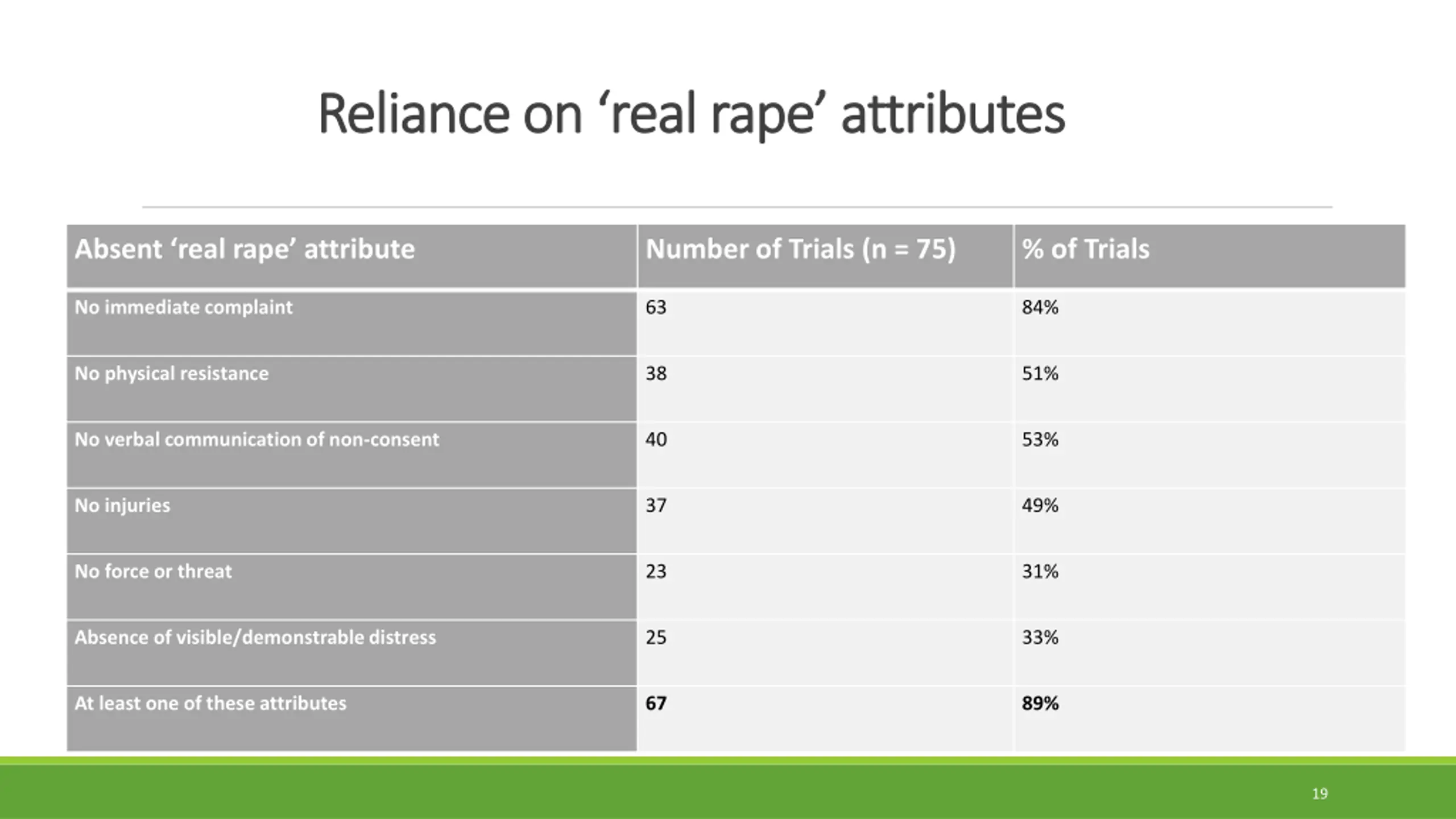 Reliance on real rape attributes Reliance on real rape attributes Absent real rape attribute Number of Trials (n = 75) % of Trials No immediate complaint 63 84% No physical resistance 38 51% No verbal communication of non-consent 40 53% No injuries 37 49% No force or threat 23 31% Absence of visible/demonstrable distress 25 33% At least one of these attributes 67 89% 19