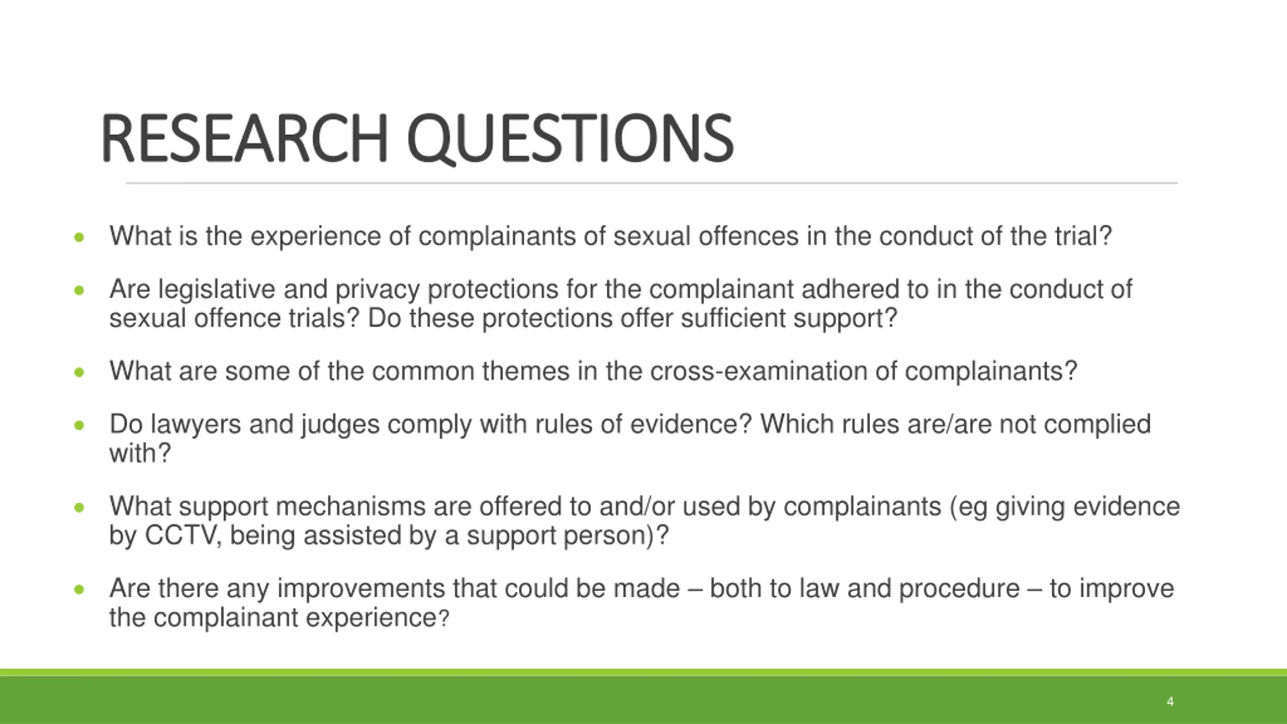 RESEARCH QUESTIONS RESEARCH QUESTIONS What is the experience of complainants of sexual offences in the conduct of the trial? Are legislative and privacy protections for the complainant adhered to in the conduct of sexual offence trials? Do these protections offer sufficient support? What are some of the common themes in the cross-examination of complainants? Do lawyers and judges comply with rules of evidence? Which rules are/are not complied with? What support mechanisms are offered to and/or used by complainants (eg giving evidence by CCTV, being assisted by a support person)? Are there any improvements that could be made both to law and procedure to improve the complainant experience? 4
