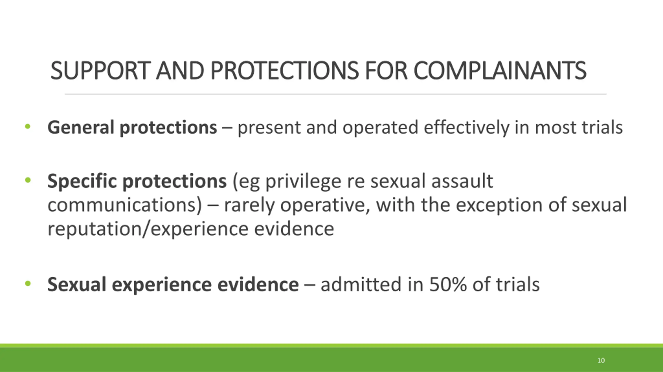 SUPPORT AND PROTECTIONS FOR COMPLAINANTS SUPPORT AND PROTECTIONS FOR COMPLAINANTS General protections present and operated effectively in most trials Specific protections (eg privilege re sexual assault communications) rarely operative, with the exception of sexual reputation/experience evidence Sexual experience evidence admitted in 50% of trials 10