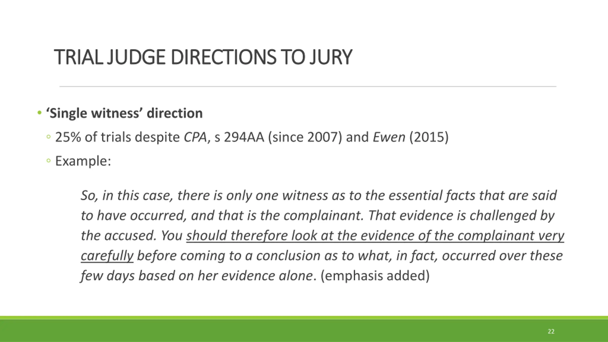 TRIAL JUDGE DIRECTIONS TO JURY TRIAL JUDGE DIRECTIONS TO JURY Single witness direction 25% of trials despite CPA, s 294AA (since 2007) and Ewen (2015) Example: So, in this case, there is only one witness as to the essential facts that are said to have occurred, and that is the complainant. That evidence is challenged by the accused. You should therefore look at the evidence of the complainant very carefully before coming to a conclusion as to what, in fact, occurred over these few days based on her evidence alone. (emphasis added) 22
