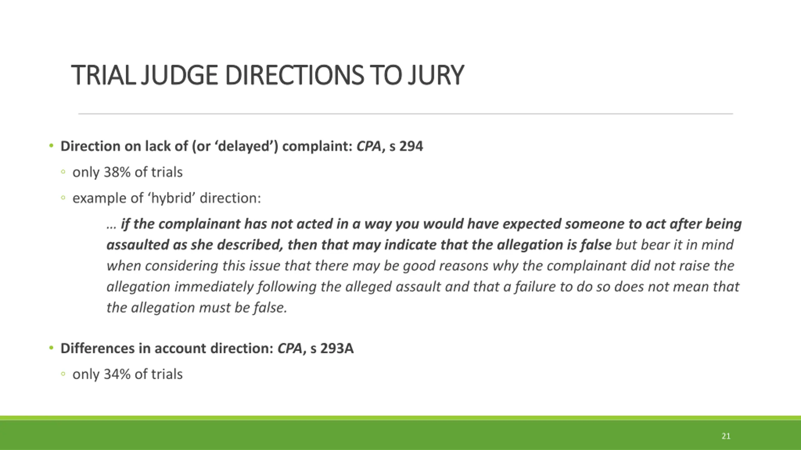 TRIAL JUDGE DIRECTIONS TO JURY TRIAL JUDGE DIRECTIONS TO JURY Direction on lack of (or delayed ) complaint: CPA, s 294 only 38% of trials example of hybrid direction: if the complainant has not acted in a way you would have expected someone to act after being assaulted as she described, then that may indicate that the allegation is false but bear it in mind when considering this issue that there may be good reasons why the complainant did not raise the allegation immediately following the alleged assault and that a failure to do so does not mean that the allegation must be false. Differences in account direction: CPA, s 293A only 34% of trials 21