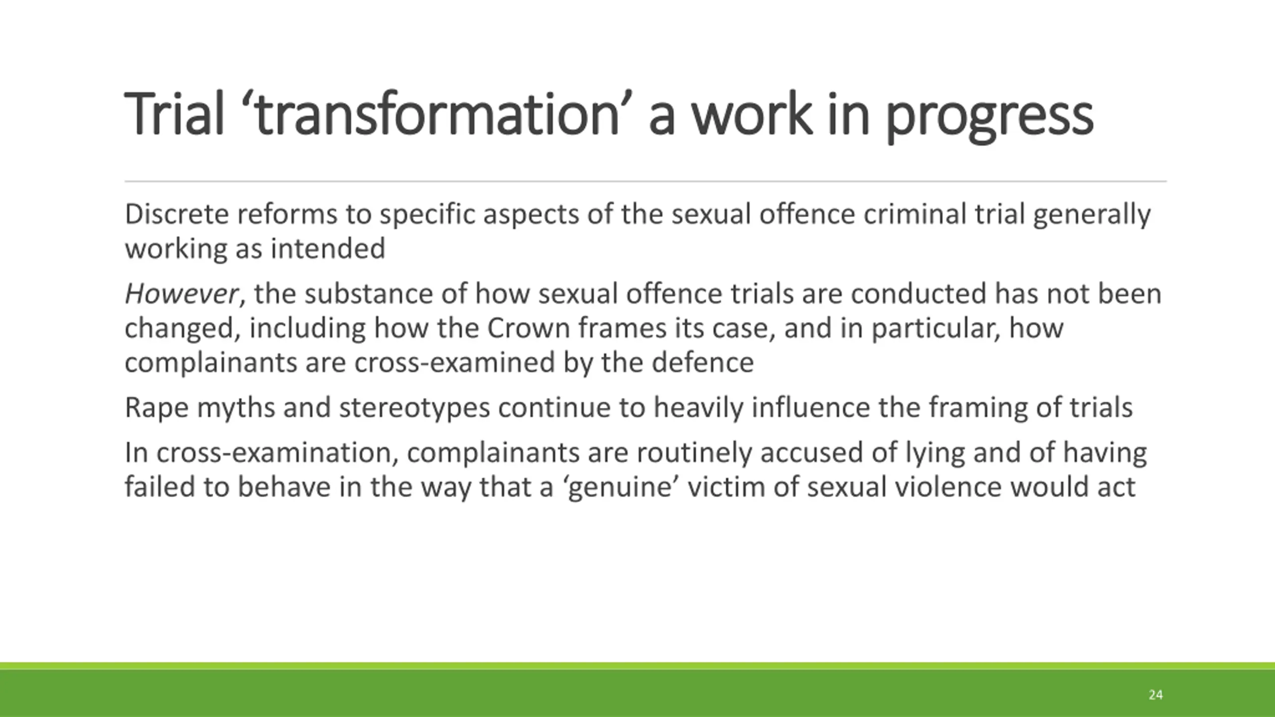 Trial transformation a work in progress Trial transformation a work in progress Discrete reforms to specific aspects of the sexual offence criminal trial generally working as intended However, the substance of how sexual offence trials are conducted has not been changed, including how the Crown frames its case, and in particular, how complainants are cross-examined by the defence Rape myths and stereotypes continue to heavily influence the framing of trials In cross-examination, complainants are routinely accused of lying and of having failed to behave in the way that a genuine victim of sexual violence would act 24