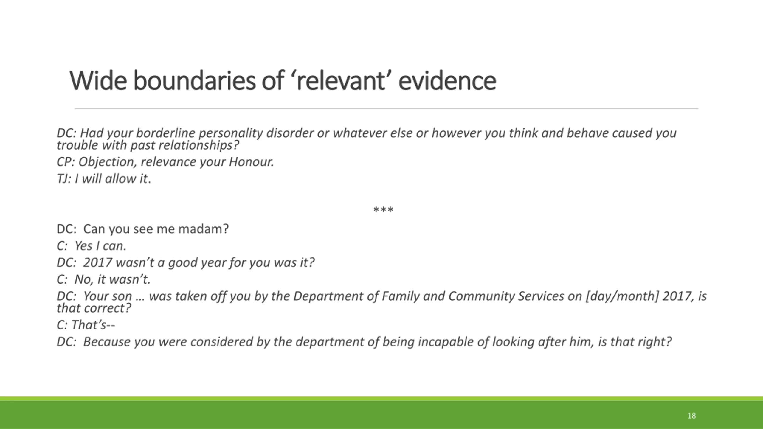 Wide boundaries of relevant evidence Wide boundaries of relevant evidence DC: Had your borderline personality disorder or whatever else or however you think and behave caused you trouble with past relationships? CP: Objection, relevance your Honour. TJ: I will allow it. *** DC: Can you see me madam? C: Yes I can. DC: 2017 wasn t a good year for you was it? C: No, it wasn t. DC: Your son was taken off you by the Department of Family and Community Services on [day/month] 2017, is that correct? C: That s-- DC: Because you were considered by the department of being incapable of looking after him, is that right? 18