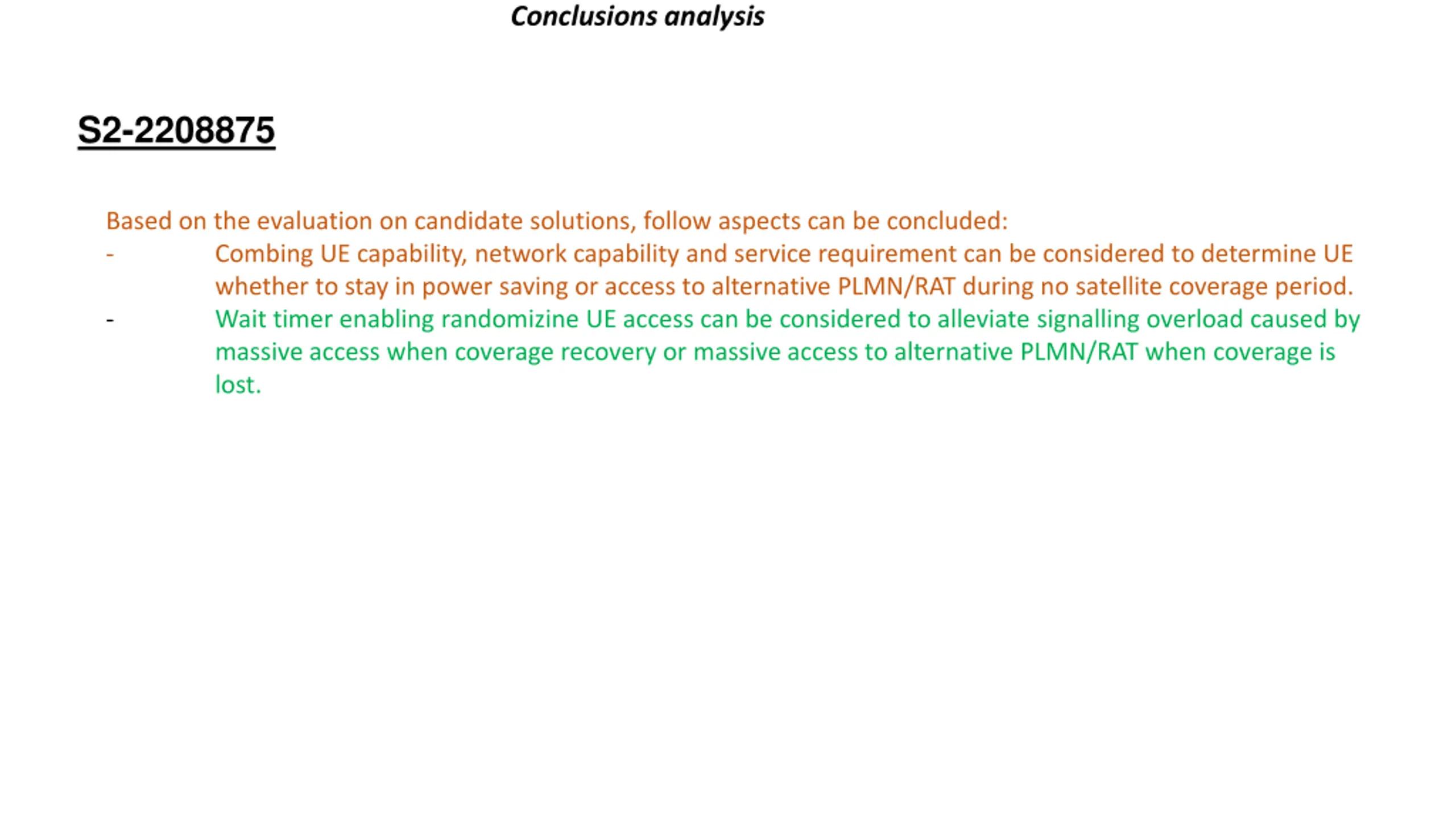 Conclusions analysis S2-2208875 Based on the evaluation on candidate solutions, follow aspects can be concluded: - Combing UE capability, network capability and service requirement can be considered to determine UE whether to stay in power saving or access to alternative PLMN/RAT during no satellite coverage period. - Wait timer enabling randomizine UE access can be considered to alleviate signalling overload caused by massive access when coverage recovery or massive access to alternative PLMN/RAT when coverage is lost.