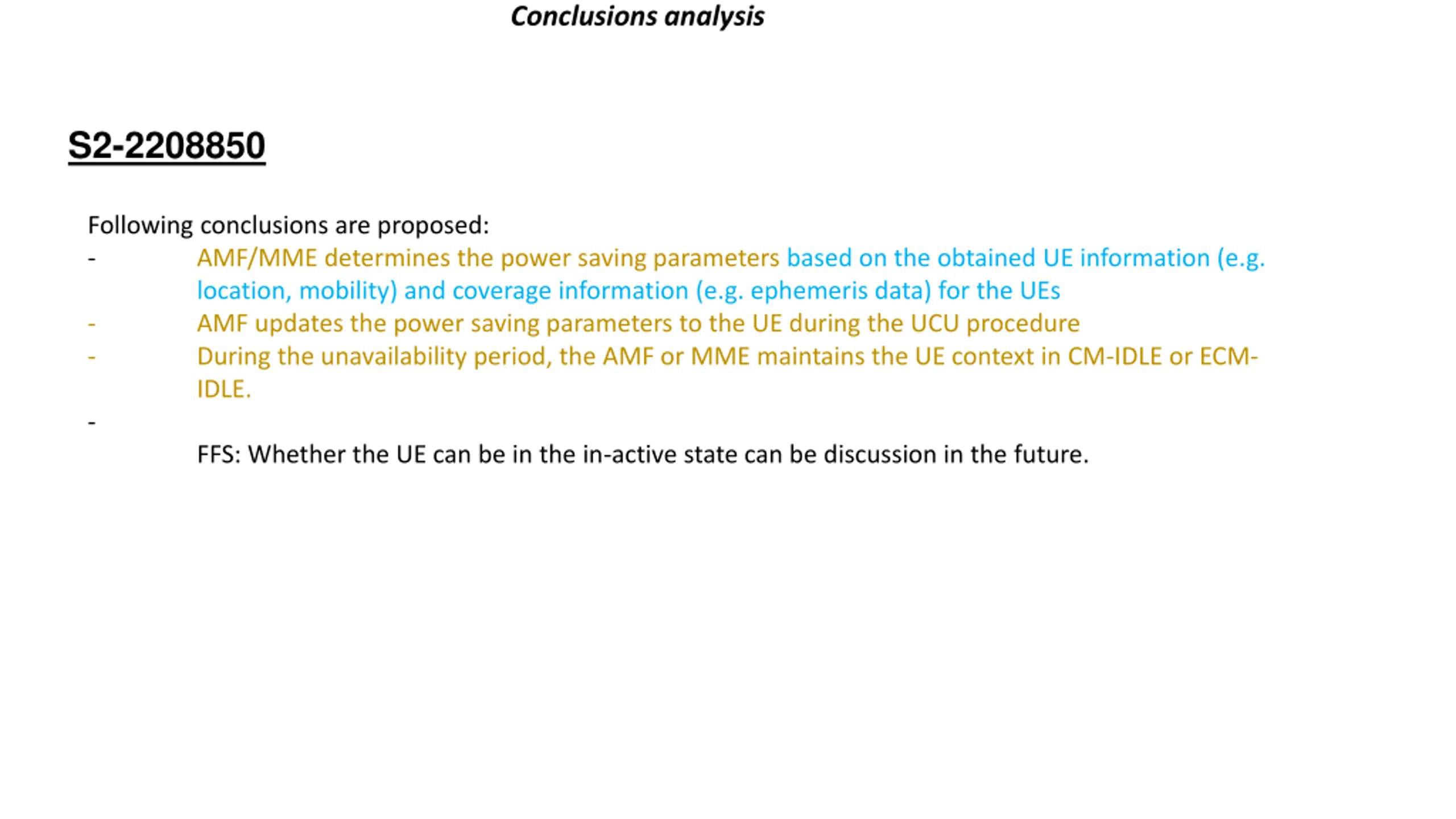Conclusions analysis S2-2208850 Following conclusions are proposed: - AMF/MME determines the power saving parameters based on the obtained UE information (e.g. location, mobility) and coverage information (e.g. ephemeris data) for the UEs - AMF updates the power saving parameters to the UE during the UCU procedure - During the unavailability period, the AMF or MME maintains the UE context in CM-IDLE or ECM- IDLE. - FFS: Whether the UE can be in the in-active state can be discussion in the future.