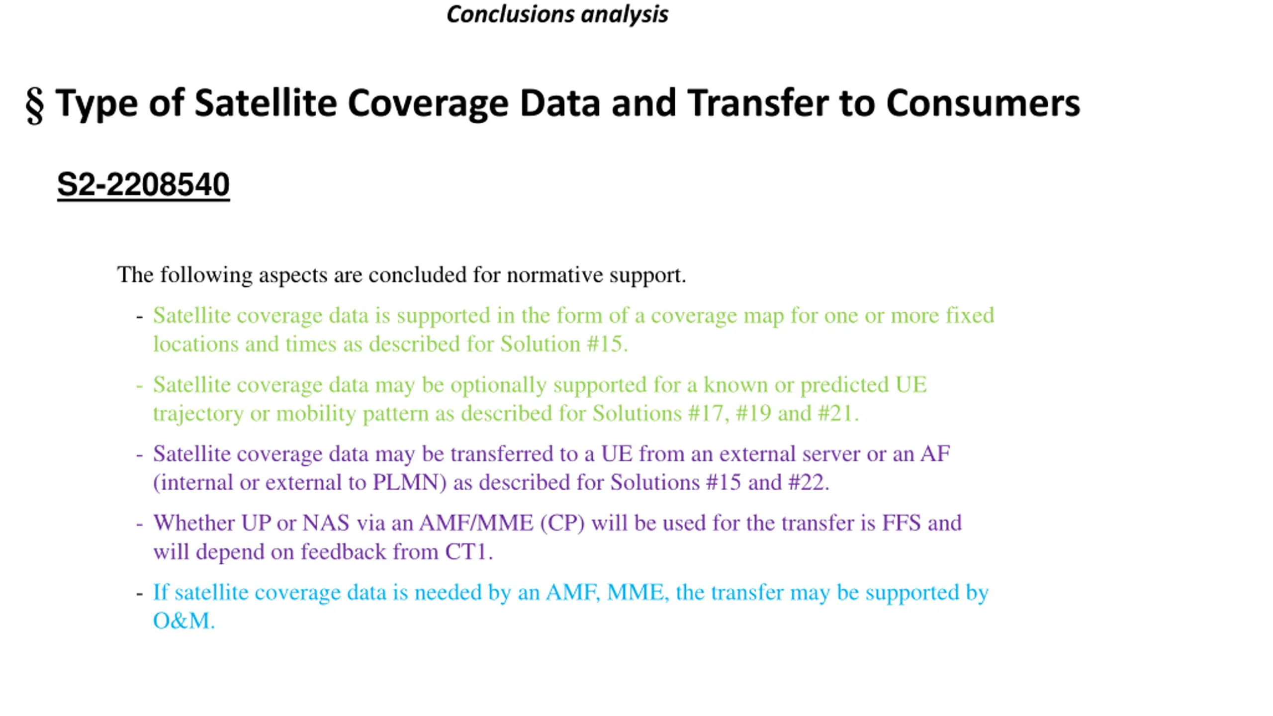 Conclusions analysis Type of Satellite Coverage Data and Transfer to Consumers S2-2208540 The following aspects are concluded for normative support. - Satellite coverage data is supported in the form of a coverage map for one or more fixed locations and times as described for Solution #15. - Satellite coverage data may be optionally supported for a known or predicted UE trajectory or mobility pattern as described for Solutions #17, #19 and #21. - Satellite coverage data may be transferred to a UE from an external server or an AF (internal or external to PLMN) as described for Solutions #15 and #22. - Whether UP or NAS via an AMF/MME (CP) will be used for the transfer is FFS and will depend on feedback from CT1. - If satellite coverage data is needed by an AMF, MME, the transfer may be supported by O&M.
