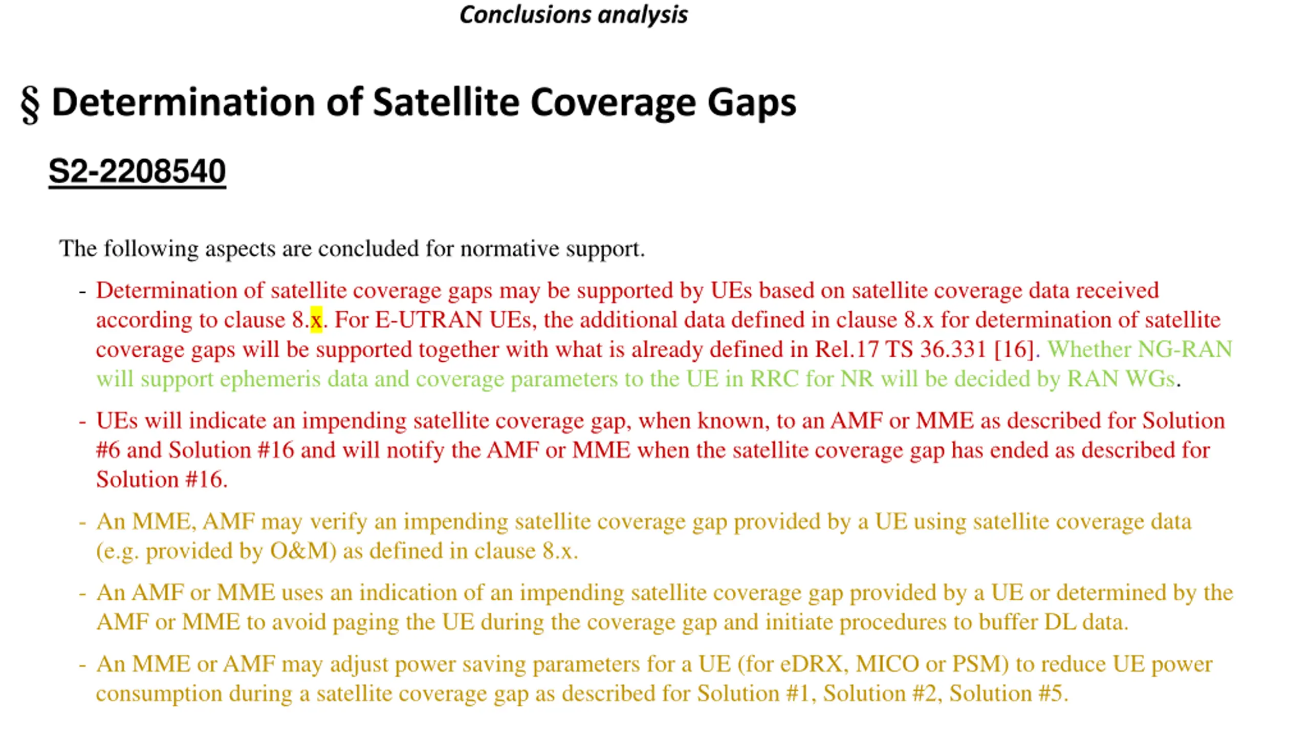 Conclusions analysis Determination of Satellite Coverage Gaps S2-2208540 The following aspects are concluded for normative support. - Determination of satellite coverage gaps may be supported by UEs based on satellite coverage data received according to clause 8.x. For E-UTRAN UEs, the additional data defined in clause 8.x for determination of satellite coverage gaps will be supported together with what is already defined in Rel.17 TS 36.331 [16]. Whether NG-RAN will support ephemeris data and coverage parameters to the UE in RRC for NR will be decided by RAN WGs. - UEs will indicate an impending satellite coverage gap, when known, to an AMF or MME as described for Solution #6 and Solution #16 and will notify the AMF or MME when the satellite coverage gap has ended as described for Solution #16. - An MME, AMF may verify an impending satellite coverage gap provided by a UE using satellite coverage data (e.g. provided by O&M) as defined in clause 8.x. - An AMF or MME uses an indication of an impending satellite coverage gap provided by a UE or determined by the AMF or MME to avoid paging the UE during the coverage gap and initiate procedures to buffer DL data. - An MME or AMF may adjust power saving parameters for a UE (for eDRX, MICO or PSM) to reduce UE power consumption during a satellite coverage gap as described for Solution #1, Solution #2, Solution #5.