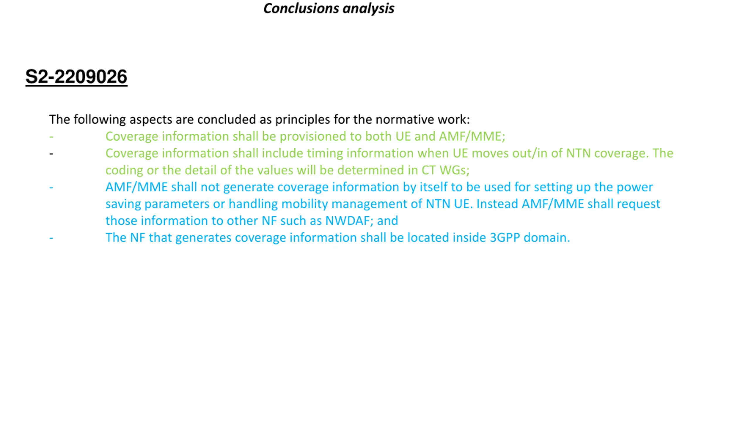 Conclusions analysis S2-2209026 The following aspects are concluded as principles for the normative work: - Coverage information shall be provisioned to both UE and AMF/MME; - Coverage information shall include timing information when UE moves out/in of NTN coverage. The coding or the detail of the values will be determined in CT WGs; - AMF/MME shall not generate coverage information by itself to be used for setting up the power saving parameters or handling mobility management of NTN UE. Instead AMF/MME shall request those information to other NF such as NWDAF; and - The NF that generates coverage information shall be located inside 3GPP domain.