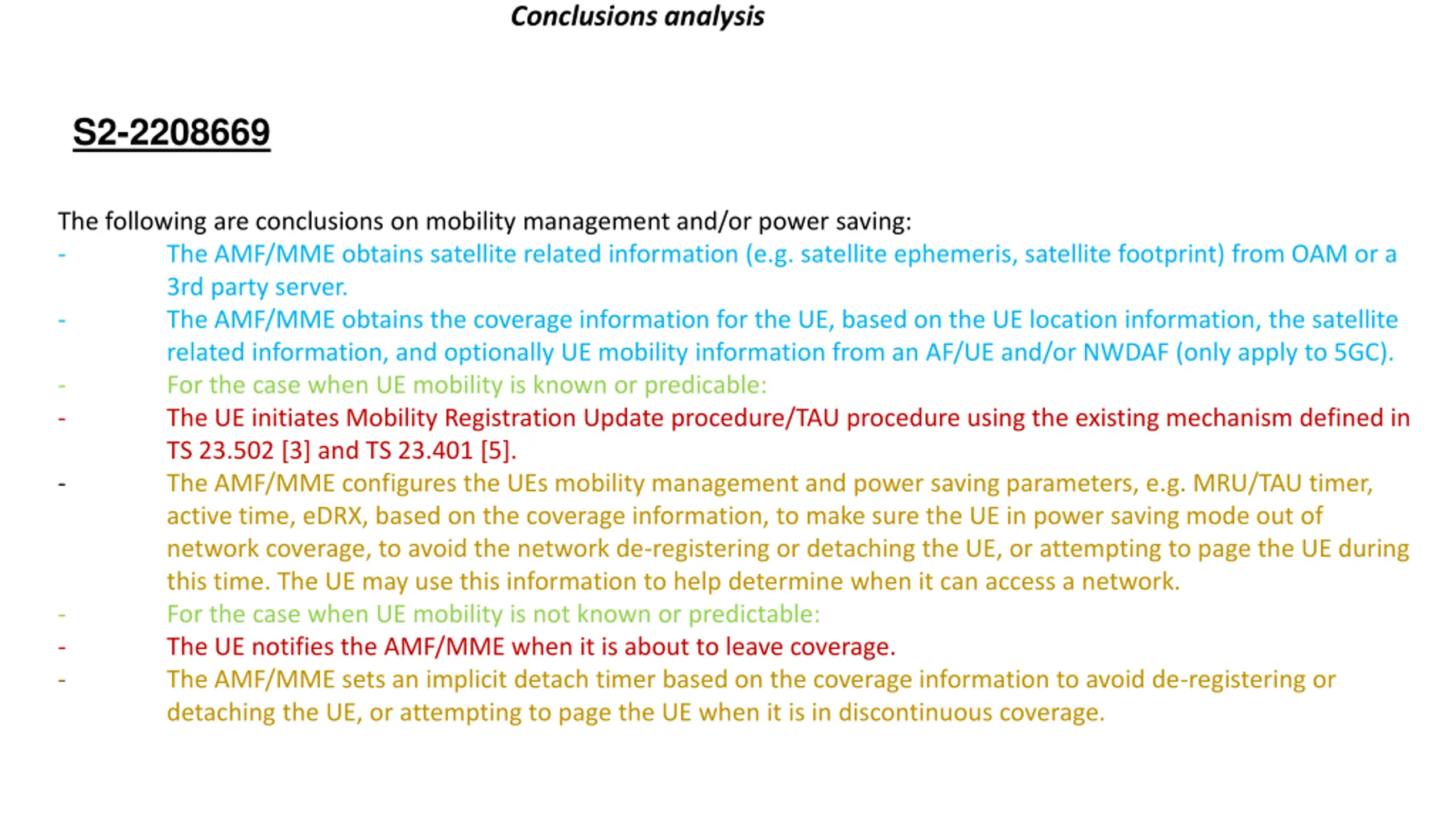 Conclusions analysis S2-2208669 The following are conclusions on mobility management and/or power saving: - The AMF/MME obtains satellite related information (e.g. satellite ephemeris, satellite footprint) from OAM or a 3rd party server. - The AMF/MME obtains the coverage information for the UE, based on the UE location information, the satellite related information, and optionally UE mobility information from an AF/UE and/or NWDAF (only apply to 5GC). - For the case when UE mobility is known or predicable: - The UE initiates Mobility Registration Update procedure/TAU procedure using the existing mechanism defined in TS 23.502 [3] and TS 23.401 [5]. - The AMF/MME configures the UEs mobility management and power saving parameters, e.g. MRU/TAU timer, active time, eDRX, based on the coverage information, to make sure the UE in power saving mode out of network coverage, to avoid the network de-registering or detaching the UE, or attempting to page the UE during this time. The UE may use this information to help determine when it can access a network. - For the case when UE mobility is not known or predictable: - The UE notifies the AMF/MME when it is about to leave coverage. - The AMF/MME sets an implicit detach timer based on the coverage information to avoid de-registering or detaching the UE, or attempting to page the UE when it is in discontinuous coverage.