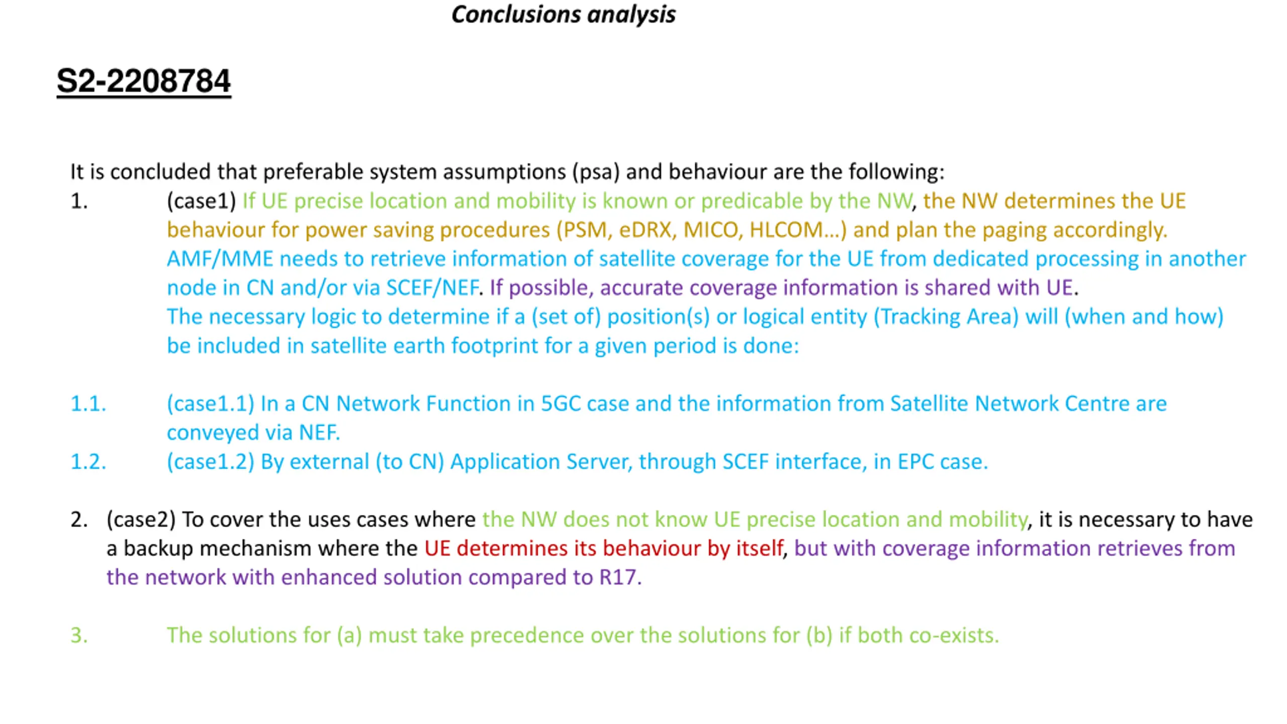 Conclusions analysis S2-2208784 It is concluded that preferable system assumptions (psa) and behaviour are the following: 1. (case1) If UE precise location and mobility is known or predicable by the NW, the NW determines the UE behaviour for power saving procedures (PSM, eDRX, MICO, HLCOM ) and plan the paging accordingly. AMF/MME needs to retrieve information of satellite coverage for the UE from dedicated processing in another node in CN and/or via SCEF/NEF. If possible, accurate coverage information is shared with UE. The necessary logic to determine if a (set of) position(s) or logical entity (Tracking Area) will (when and how) be included in satellite earth footprint for a given period is done: 1.1. (case1.1) In a CN Network Function in 5GC case and the information from Satellite Network Centre are conveyed via NEF. (case1.2) By external (to CN) Application Server, through SCEF interface, in EPC case. 1.2. 2. (case2) To cover the uses cases where the NW does not know UE precise location and mobility, it is necessary to have a backup mechanism where the UE determines its behaviour by itself, but with coverage information retrieves from the network with enhanced solution compared to R17. 3. The solutions for (a) must take precedence over the solutions for (b) if both co-exists.