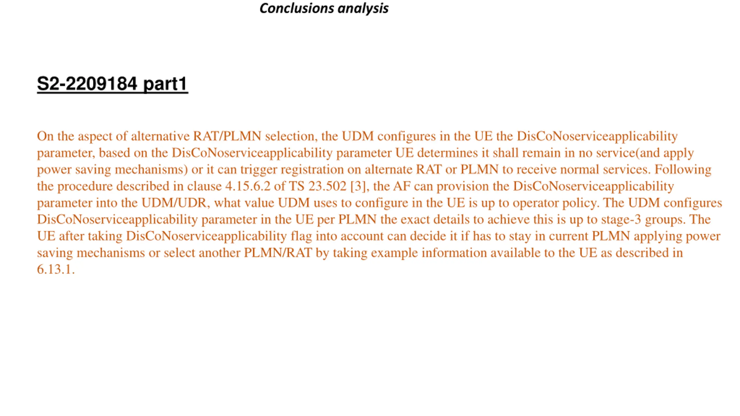 Conclusions analysis S2-2209184 part1 On the aspect of alternative RAT/PLMN selection, the UDM configures in the UE the DisCoNoserviceapplicability parameter, based on the DisCoNoserviceapplicability parameter UE determines it shall remain in no service(and apply power saving mechanisms) or it can trigger registration on alternate RAT or PLMN to receive normal services. Following the procedure described in clause 4.15.6.2 of TS 23.502 [3], the AF can provision the DisCoNoserviceapplicability parameter into the UDM/UDR, what value UDM uses to configure in the UE is up to operator policy. The UDM configures DisCoNoserviceapplicability parameter in the UE per PLMN the exact details to achieve this is up to stage-3 groups. The UE after taking DisCoNoserviceapplicability flag into account can decide it if has to stay in current PLMN applying power saving mechanisms or select another PLMN/RAT by taking example information available to the UE as described in 6.13.1.