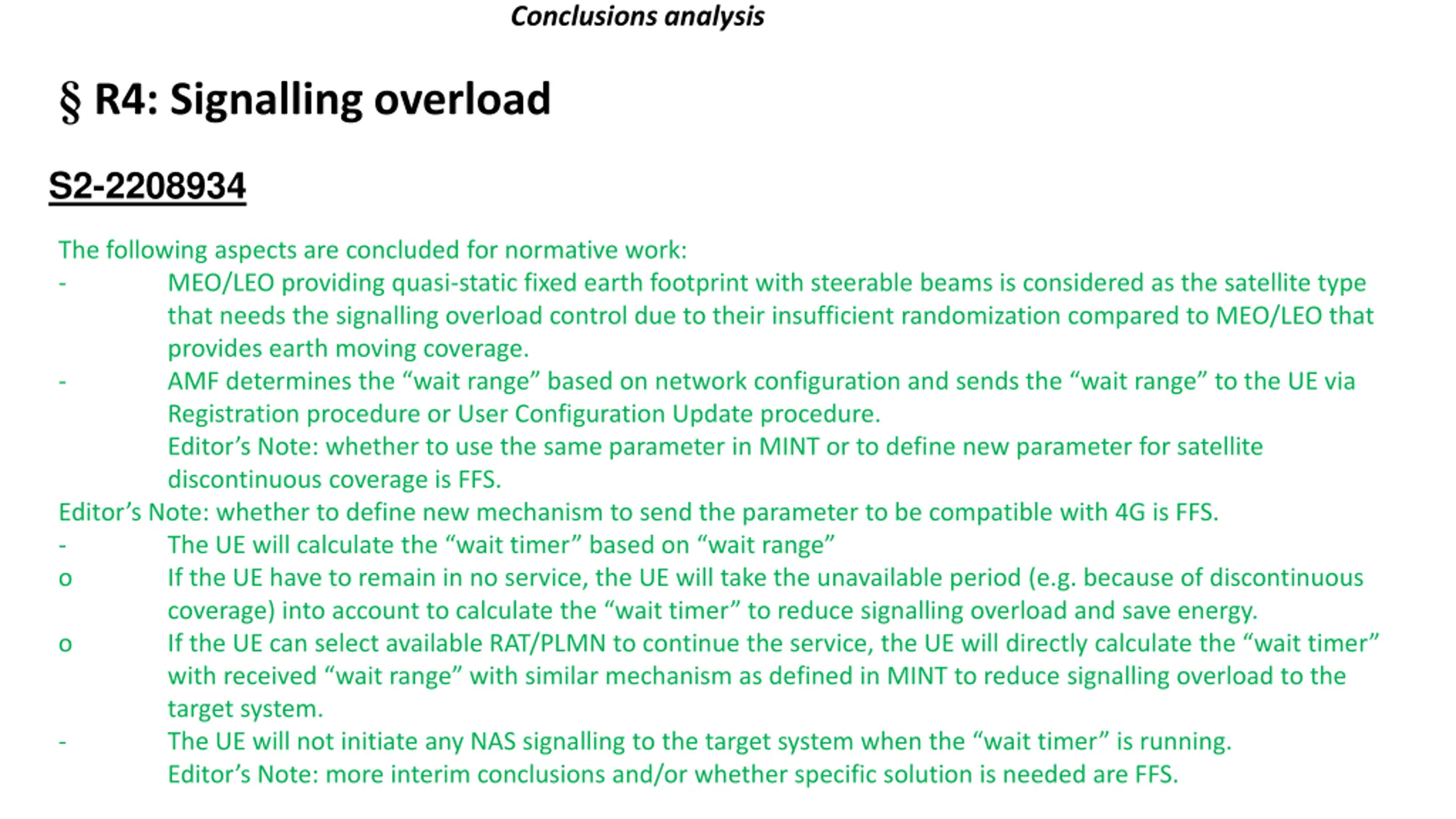 Conclusions analysis R4: Signalling overload S2-2208934 The following aspects are concluded for normative work: - MEO/LEO providing quasi-static fixed earth footprint with steerable beams is considered as the satellite type that needs the signalling overload control due to their insufficient randomization compared to MEO/LEO that provides earth moving coverage. - AMF determines the wait range based on network configuration and sends the wait range to the UE via Registration procedure or User Configuration Update procedure. Editor s Note: whether to use the same parameter in MINT or to define new parameter for satellite discontinuous coverage is FFS. Editor s Note: whether to define new mechanism to send the parameter to be compatible with 4G is FFS. - The UE will calculate the wait timer based on wait range o If the UE have to remain in no service, the UE will take the unavailable period (e.g. because of discontinuous coverage) into account to calculate the wait timer to reduce signalling overload and save energy. o If the UE can select available RAT/PLMN to continue the service, the UE will directly calculate the wait timer with received wait range with similar mechanism as defined in MINT to reduce signalling overload to the target system. - The UE will not initiate any NAS signalling to the target system when the wait timer is running. Editor s Note: more interim conclusions and/or whether specific solution is needed are FFS.