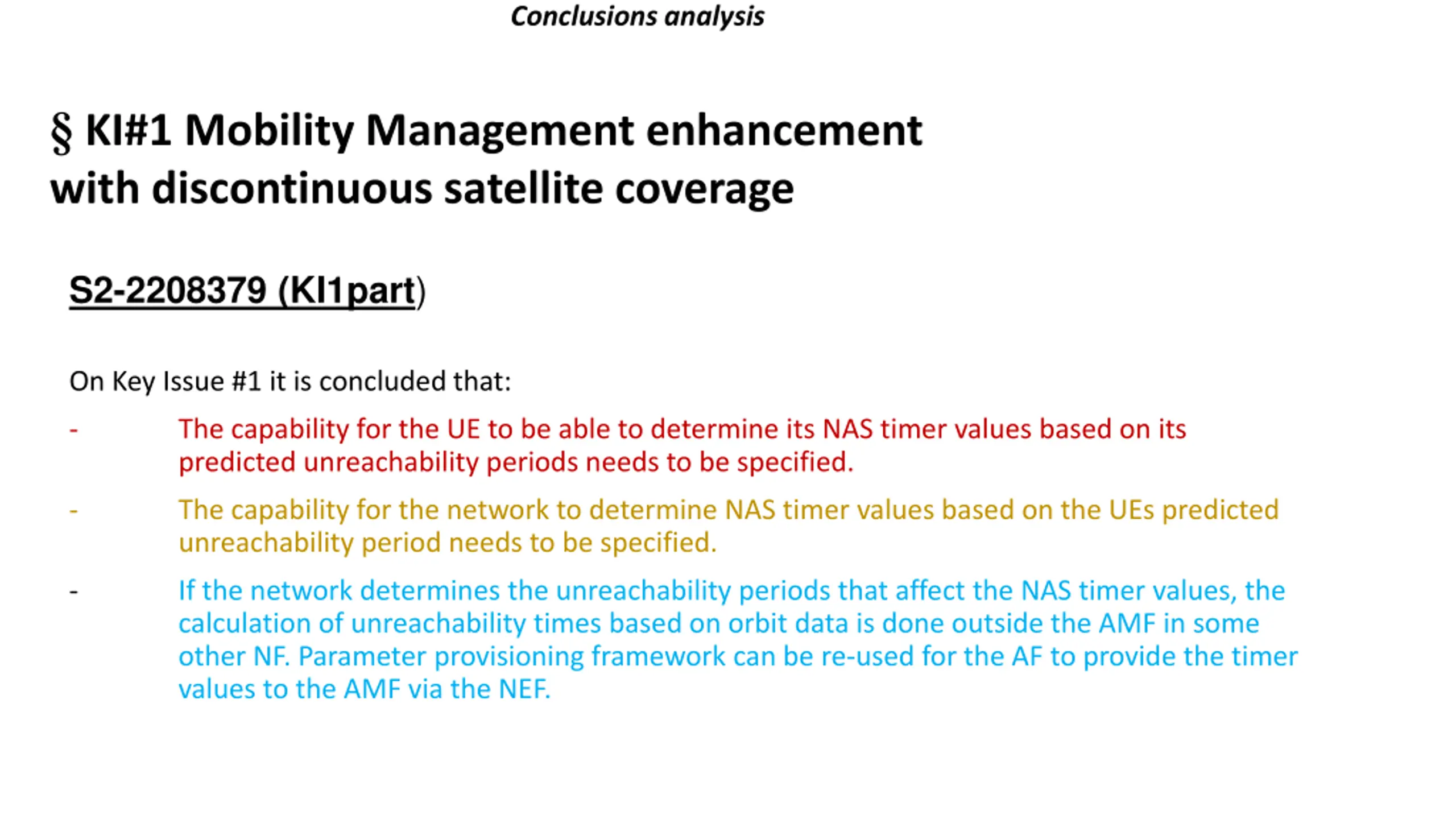 Conclusions analysis KI#1 Mobility Management enhancement with discontinuous satellite coverage S2-2208379 (KI1part) On Key Issue #1 it is concluded that: - The capability for the UE to be able to determine its NAS timer values based on its predicted unreachability periods needs to be specified. - The capability for the network to determine NAS timer values based on the UEs predicted unreachability period needs to be specified. - If the network determines the unreachability periods that affect the NAS timer values, the calculation of unreachability times based on orbit data is done outside the AMF in some other NF. Parameter provisioning framework can be re-used for the AF to provide the timer values to the AMF via the NEF.
