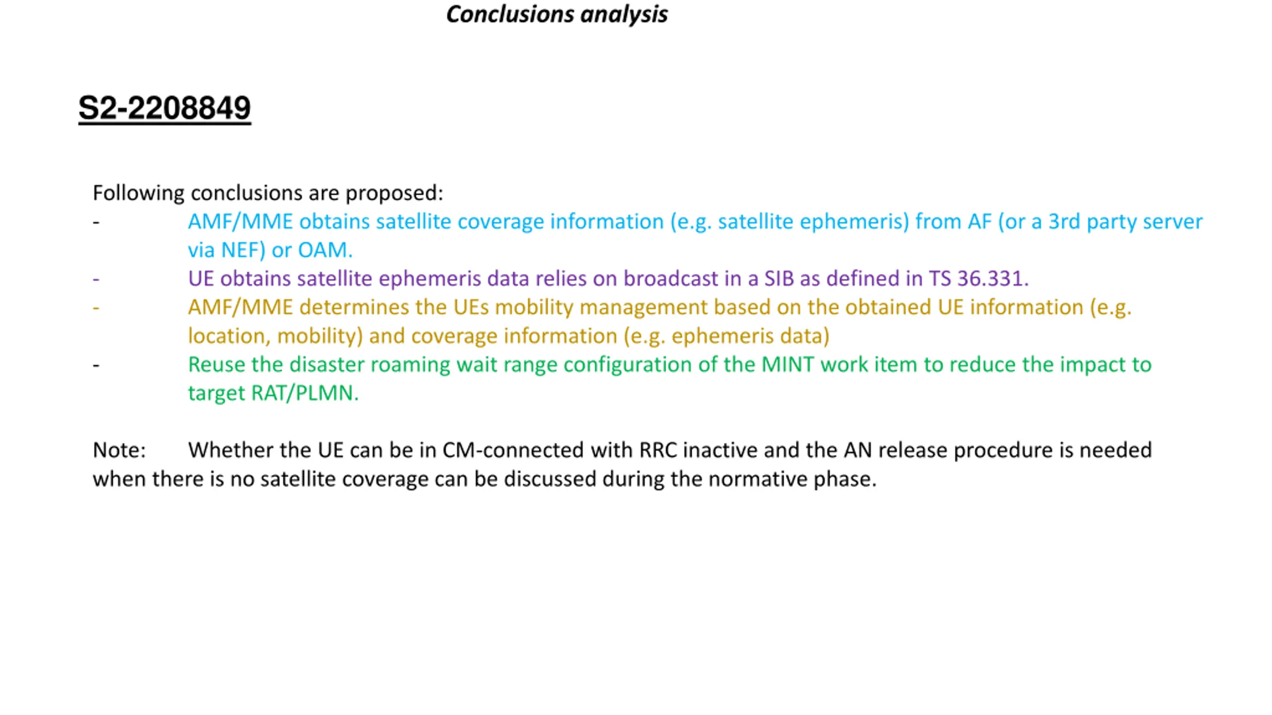Conclusions analysis S2-2208849 Following conclusions are proposed: - AMF/MME obtains satellite coverage information (e.g. satellite ephemeris) from AF (or a 3rd party server via NEF) or OAM. - UE obtains satellite ephemeris data relies on broadcast in a SIB as defined in TS 36.331. - AMF/MME determines the UEs mobility management based on the obtained UE information (e.g. location, mobility) and coverage information (e.g. ephemeris data) - Reuse the disaster roaming wait range configuration of the MINT work item to reduce the impact to target RAT/PLMN. Note: when there is no satellite coverage can be discussed during the normative phase. Whether the UE can be in CM-connected with RRC inactive and the AN release procedure is needed