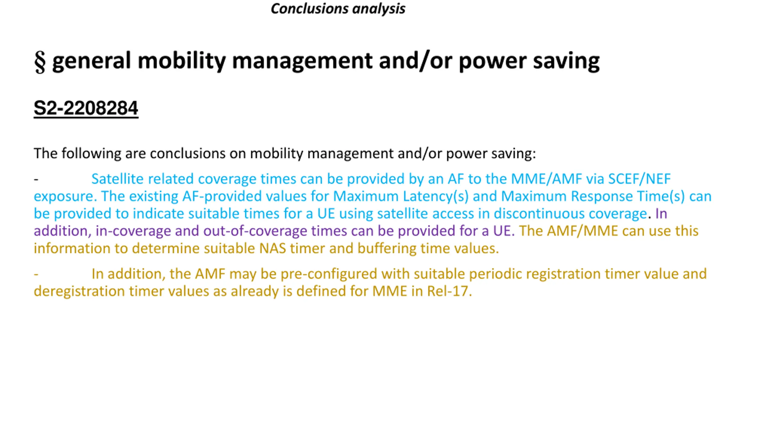 Conclusions analysis general mobility management and/or power saving S2-2208284 The following are conclusions on mobility management and/or power saving: - exposure. The existing AF-provided values for Maximum Latency(s) and Maximum Response Time(s) can be provided to indicate suitable times for a UE using satellite access in discontinuous coverage. In addition, in-coverage and out-of-coverage times can be provided for a UE. The AMF/MME can use this information to determine suitable NAS timer and buffering time values. Satellite related coverage times can be provided by an AF to the MME/AMF via SCEF/NEF - deregistration timer values as already is defined for MME in Rel-17. In addition, the AMF may be pre-configured with suitable periodic registration timer value and
