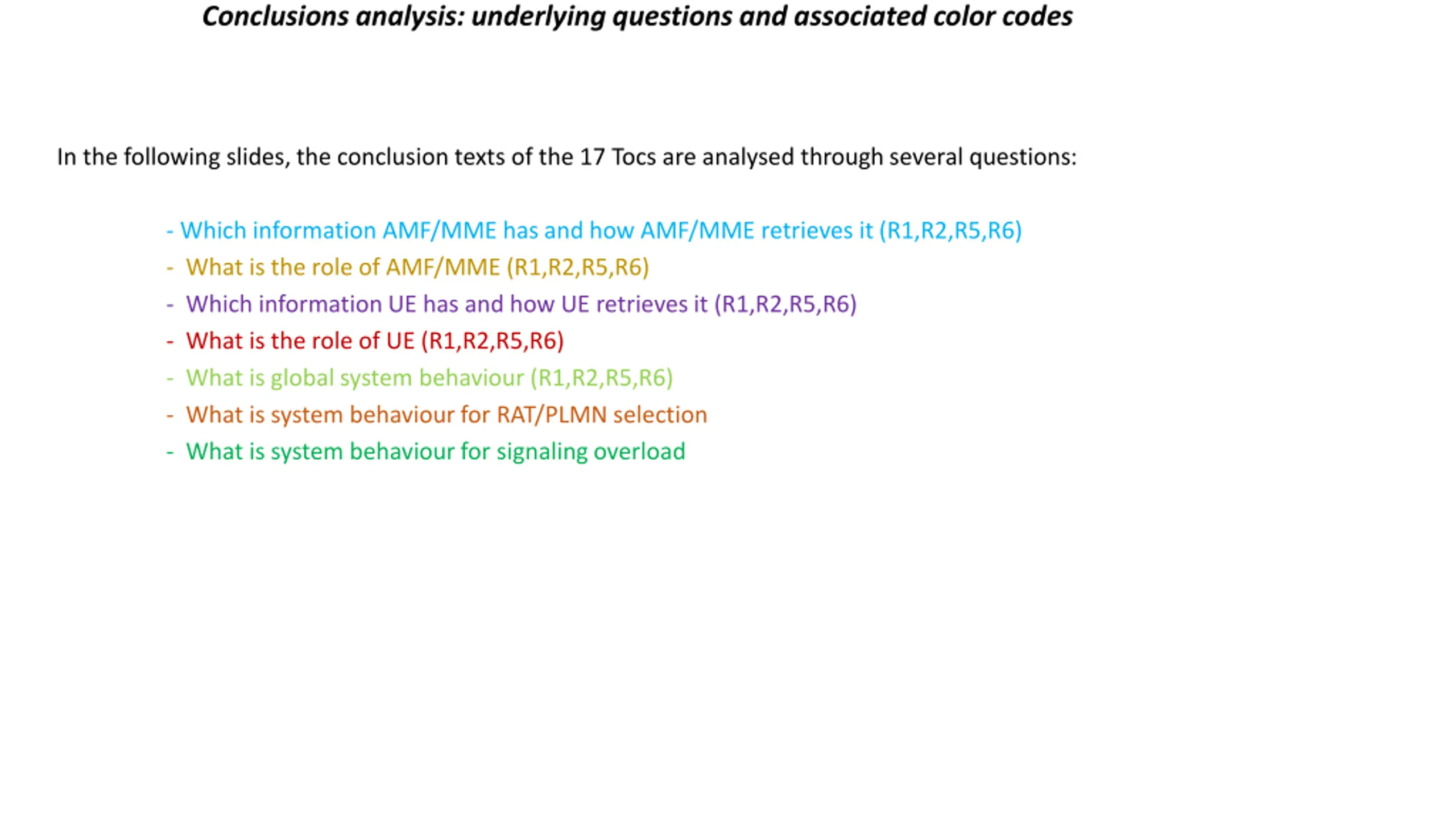 Conclusions analysis: underlying questions and associated color codes In the following slides, the conclusion texts of the 17 Tocs are analysed through several questions: - Which information AMF/MME has and how AMF/MME retrieves it (R1,R2,R5,R6) - What is the role of AMF/MME (R1,R2,R5,R6) - Which information UE has and how UE retrieves it (R1,R2,R5,R6) - What is the role of UE (R1,R2,R5,R6) - What is global system behaviour (R1,R2,R5,R6) - What is system behaviour for RAT/PLMN selection - What is system behaviour for signaling overload