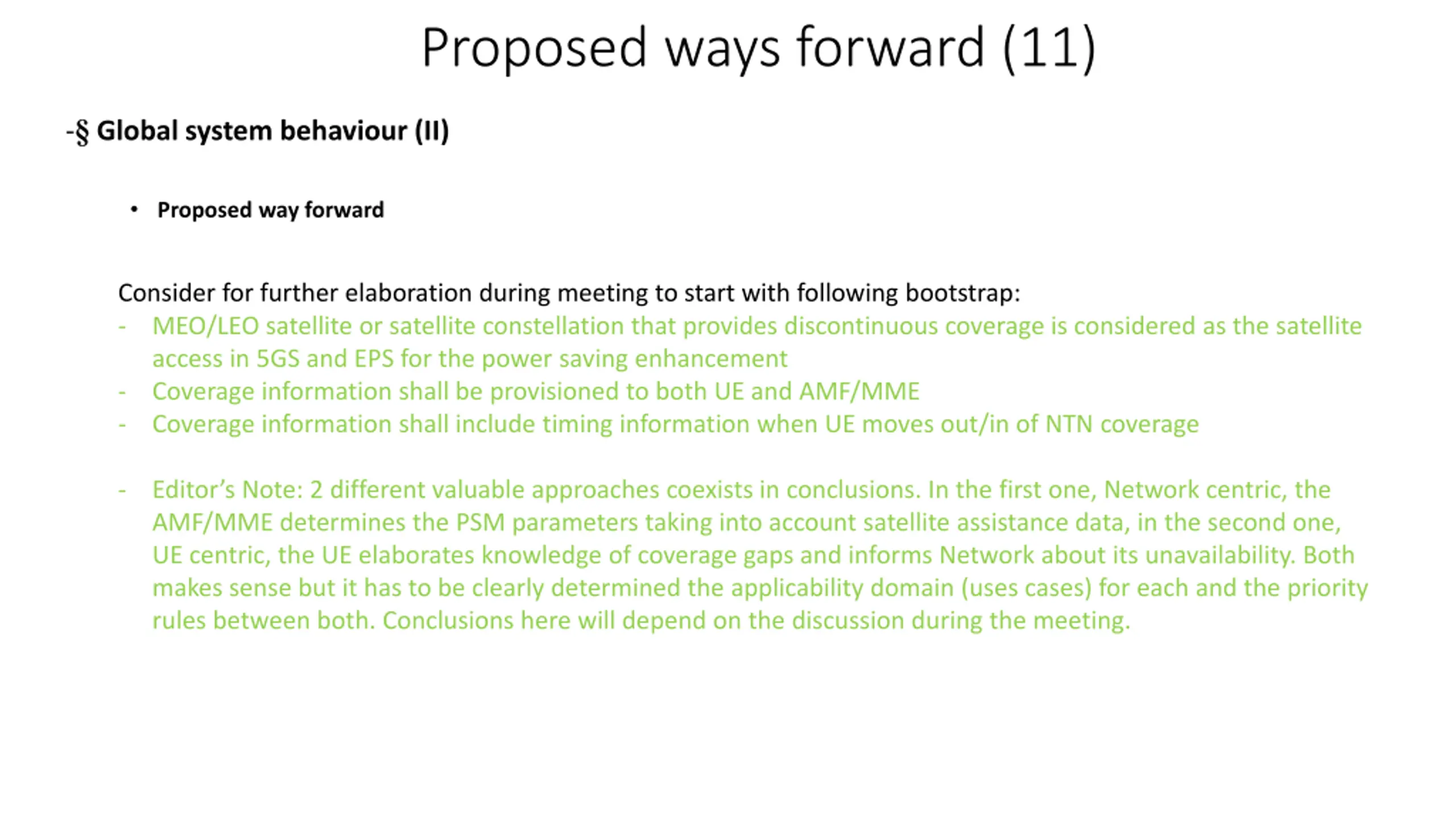 Proposed ways forward (10) - Global system behaviour (I) Related statements in conclusions: S2-2208669: For the case when UE mobility is known or predicable, , For the case when UE mobility is not known or predictable: S2-2208784: If UE precise location and mobility is known or predicable by the NW, , the NW does not know UE precise location and mobility, , The solutions for (a) must take precedence over the solutions for (b) if both co-exists. S2-2208931: MEO/LEO satellite or satellite constellation that provides discontinuous coverage is considered as the satellite access in 5GS and EPS for the mobility management enhancement. S2-2208932: MEO/LEO satellite or satellite constellation that provides discontinuous coverage is considered as the satellite access in 5GS and EPS for the power saving enhancement S2-2208540: Satellite coverage data is supported in the form of a coverage map for one or more fixed locations and times as described for Solution #15.Satellite coverage data may be optionally supported for a known or predicted UE trajectory or mobility pattern as described for Solutions #17, #19 and #21. Whether NG-RAN will support ephemeris data and coverage parameters to the UE in RRC for NR will be decided by RAN WGs S2-2208540: Coverage information shall be provisioned to both UE and AMF/MME; Coverage information shall include timing information when UE moves out/in of NTN coverage. The coding or the detail of the values will be determined in CT WGs;