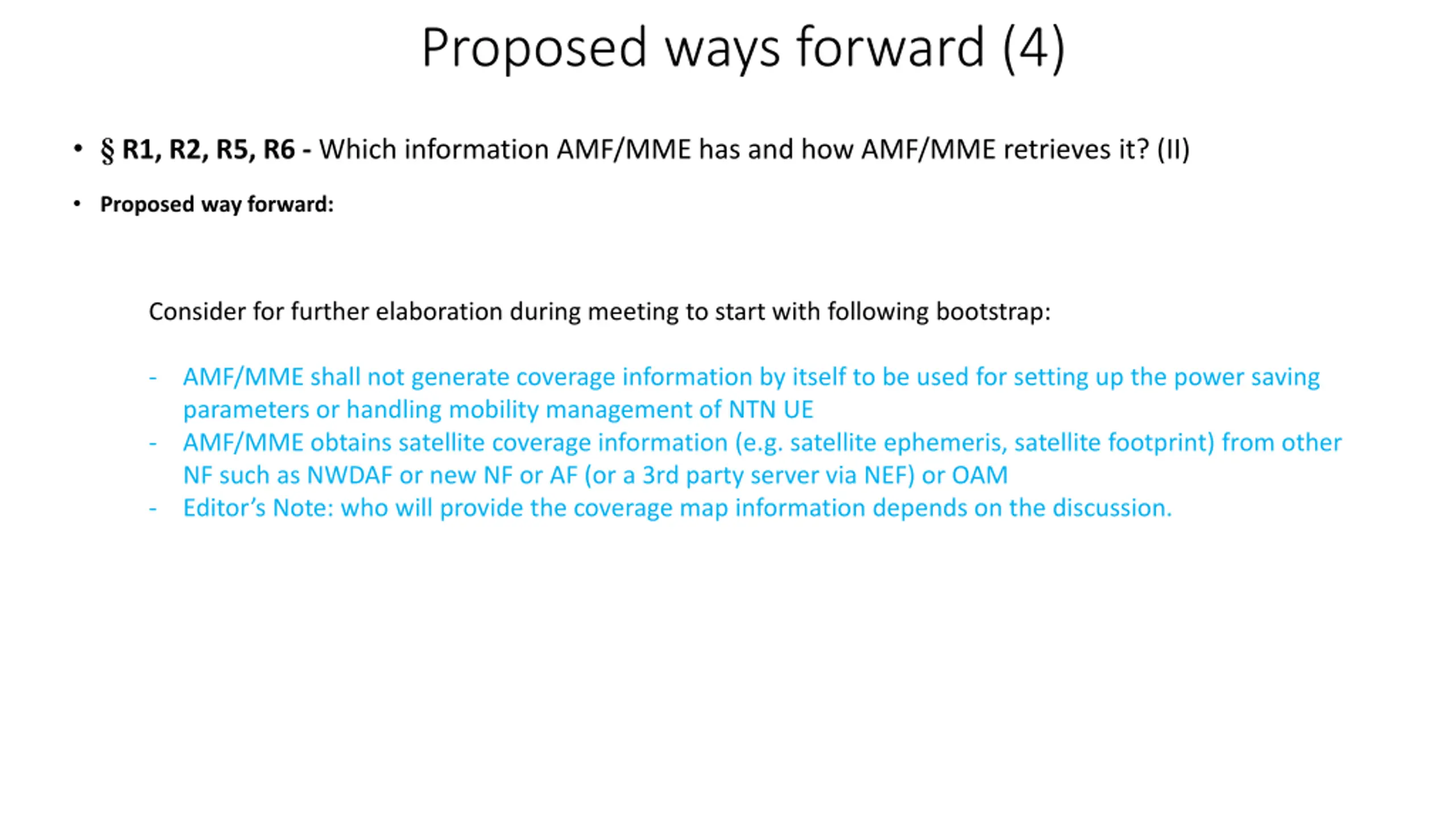 Proposed ways forward (4) R1, R2, R5, R6 - Which information AMF/MME has and how AMF/MME retrieves it? (II) Proposed way forward: Consider for further elaboration during meeting to start with following bootstrap: - AMF/MME shall not generate coverage information by itself to be used for setting up the power saving parameters or handling mobility management of NTN UE AMF/MME obtains satellite coverage information (e.g. satellite ephemeris, satellite footprint) from other NF such as NWDAF or new NF or AF (or a 3rd party server via NEF) or OAM Editor s Note: who will provide the coverage map information depends on the discussion. - -