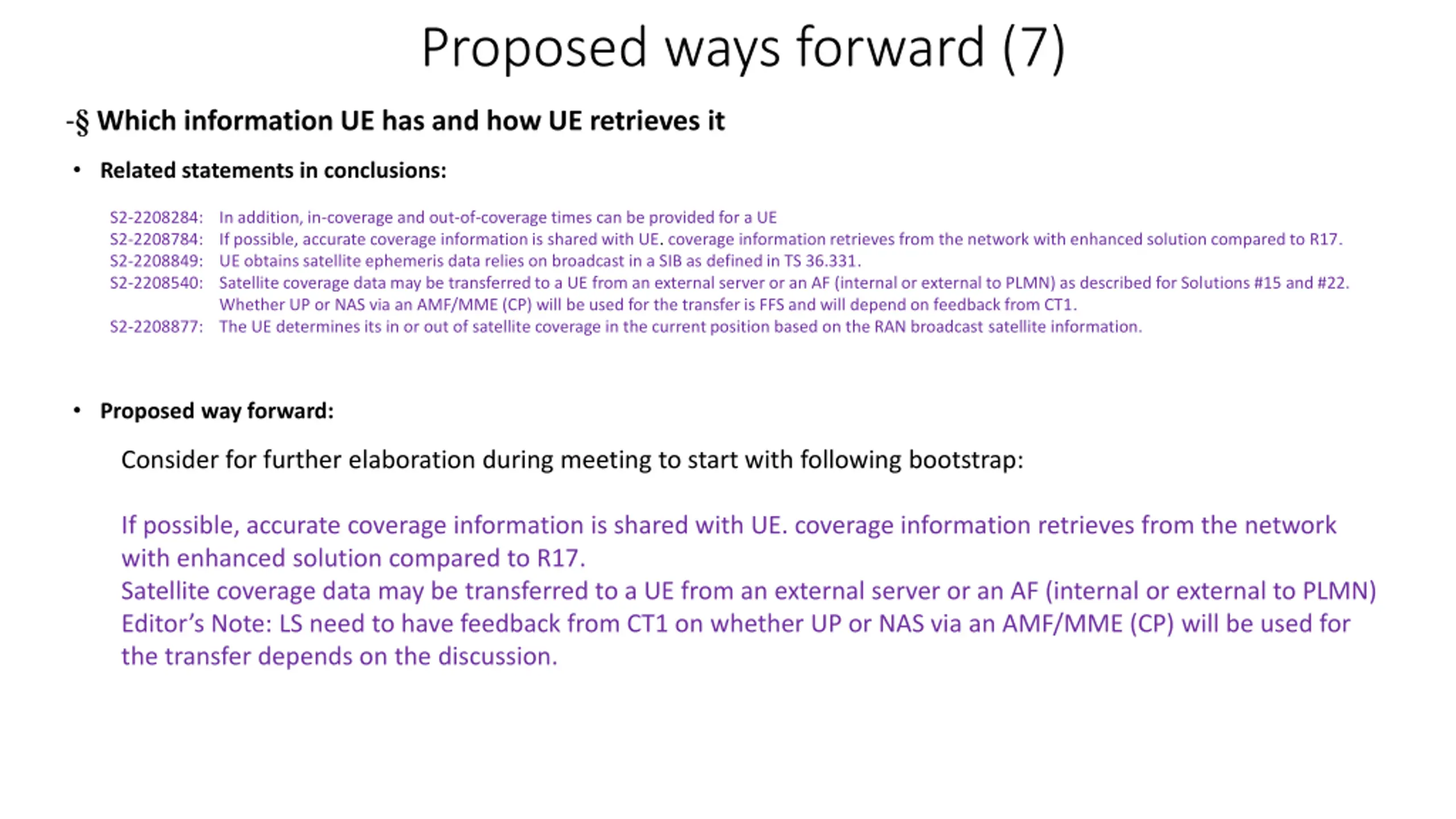 Proposed ways forward (7) - Which information UE has and how UE retrieves it Related statements in conclusions: S2-2208284: In addition, in-coverage and out-of-coverage times can be provided for a UE S2-2208784: If possible, accurate coverage information is shared with UE. coverage information retrieves from the network with enhanced solution compared to R17. S2-2208849: UE obtains satellite ephemeris data relies on broadcast in a SIB as defined in TS 36.331. S2-2208540: Satellite coverage data may be transferred to a UE from an external server or an AF (internal or external to PLMN) as described for Solutions #15 and #22. Whether UP or NAS via an AMF/MME (CP) will be used for the transfer is FFS and will depend on feedback from CT1. S2-2208877: The UE determines its in or out of satellite coverage in the current position based on the RAN broadcast satellite information. Proposed way forward: Consider for further elaboration during meeting to start with following bootstrap: If possible, accurate coverage information is shared with UE. coverage information retrieves from the network with enhanced solution compared to R17. Satellite coverage data may be transferred to a UE from an external server or an AF (internal or external to PLMN) Editor s Note: LS need to have feedback from CT1 on whether UP or NAS via an AMF/MME (CP) will be used for the transfer depends on the discussion.