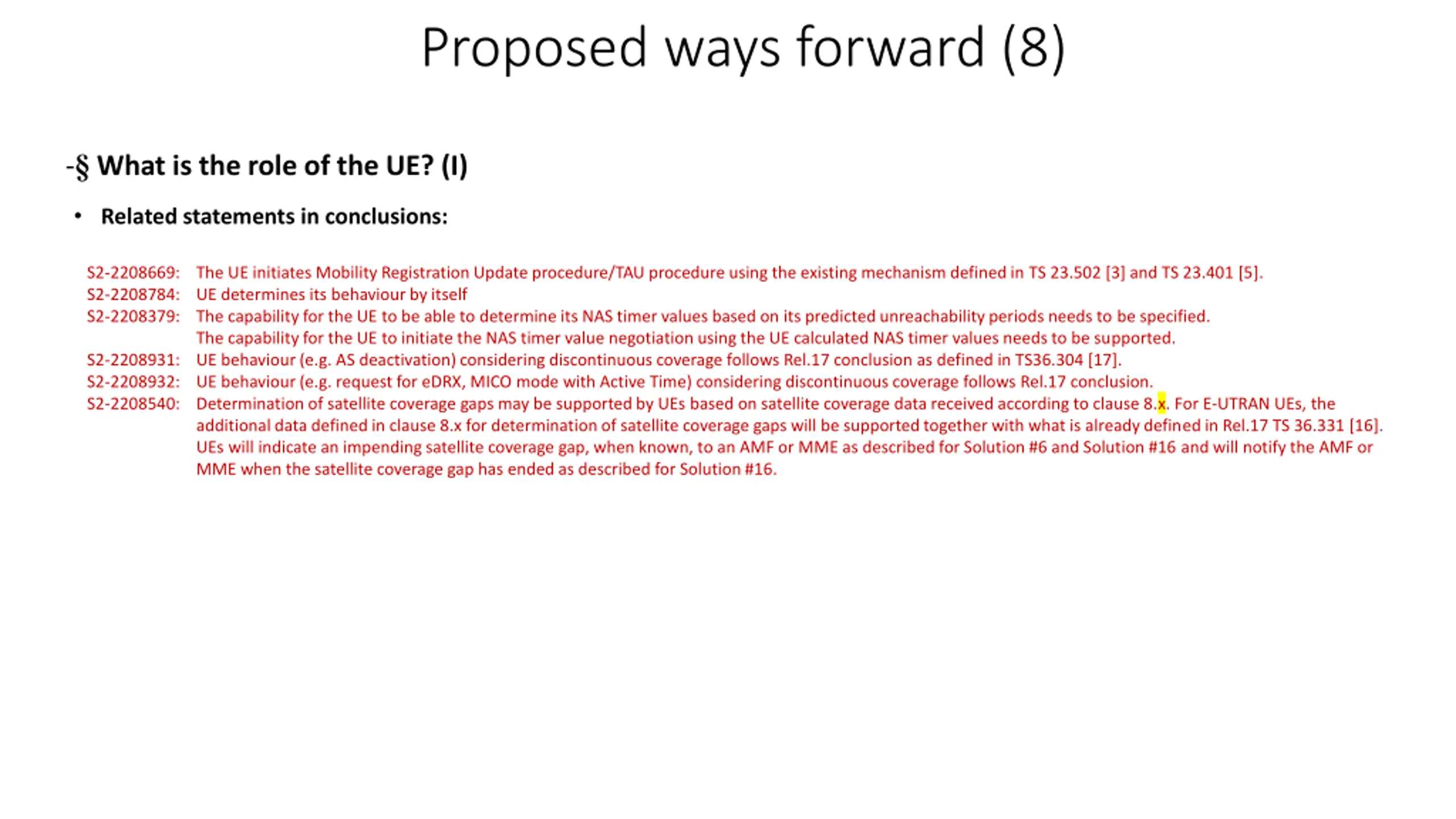 Proposed ways forward (8) - What is the role of the UE? (I) Related statements in conclusions: S2-2208669: The UE initiates Mobility Registration Update procedure/TAU procedure using the existing mechanism defined in TS 23.502 [3] and TS 23.401 [5]. S2-2208784: UE determines its behaviour by itself S2-2208379: The capability for the UE to be able to determine its NAS timer values based on its predicted unreachability periods needs to be specified. The capability for the UE to initiate the NAS timer value negotiation using the UE calculated NAS timer values needs to be supported. S2-2208931: UE behaviour (e.g. AS deactivation) considering discontinuous coverage follows Rel.17 conclusion as defined in TS36.304 [17]. S2-2208932: UE behaviour (e.g. request for eDRX, MICO mode with Active Time) considering discontinuous coverage follows Rel.17 conclusion. S2-2208540: Determination of satellite coverage gaps may be supported by UEs based on satellite coverage data received according to clause 8.x. For E-UTRAN UEs, the additional data defined in clause 8.x for determination of satellite coverage gaps will be supported together with what is already defined in Rel.17 TS 36.331 [16]. UEs will indicate an impending satellite coverage gap, when known, to an AMF or MME as described for Solution #6 and Solution #16 and will notify the AMF or MME when the satellite coverage gap has ended as described for Solution #16.