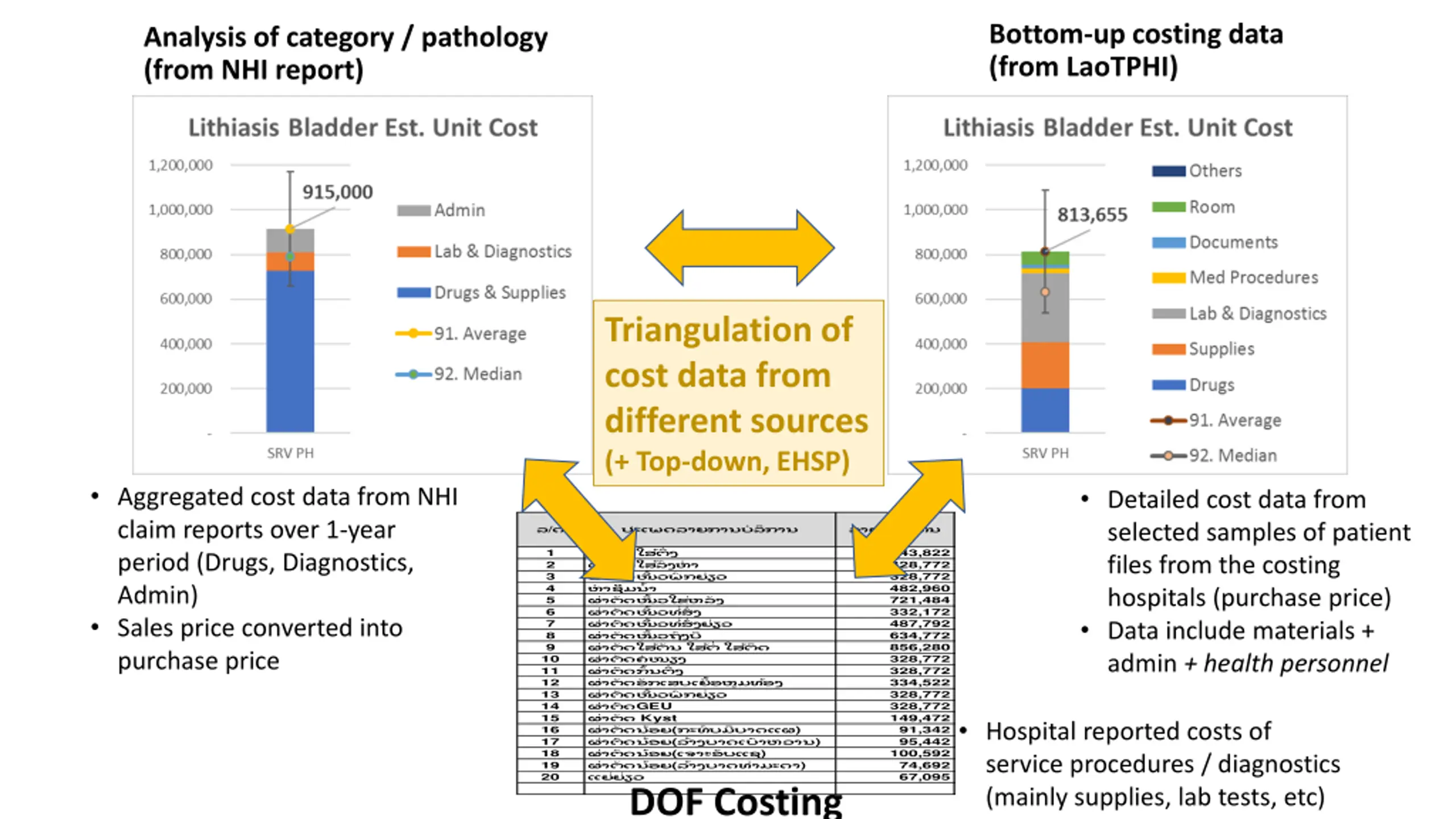 Bottom-up costing data (from LaoTPHI) Analysis of category / pathology (from NHI report) Triangulation of cost data from different sources (+ Top-down, EHSP) Aggregated cost data from NHI claim reports over 1-year period (Drugs, Diagnostics, Admin) Sales price converted into purchase price Detailed cost data from selected samples of patient files from the costing hospitals (purchase price) Data include materials + admin + health personnel / GEU Kyst ( ) ( ) ( ) ( ) DOF Costing 1 2 3 4 5 6 7 8 9 543,822 328,772 328,772 482,960 721,484 332,172 487,792 634,772 856,280 328,772 328,772 334,522 328,772 328,772 149,472 91,342 95,442 100,592 74,692 67,095 10 11 12 13 14 15 16 17 18 19 20 Hospital reported costs of service procedures / diagnostics (mainly supplies, lab tests, etc)