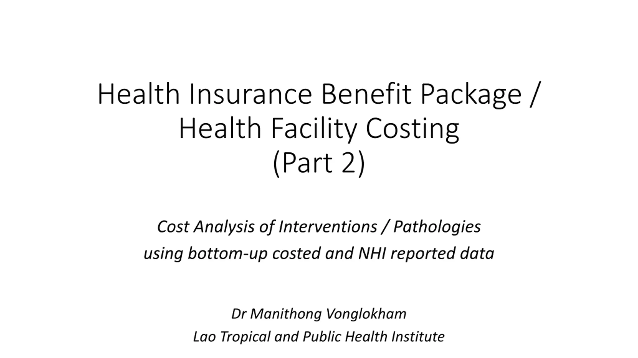 Health Insurance Benefit Package / Health Facility Costing (Part 2) Cost Analysis of Interventions / Pathologies using bottom-up costed and NHI reported data Dr Manithong Vonglokham Lao Tropical and Public Health Institute