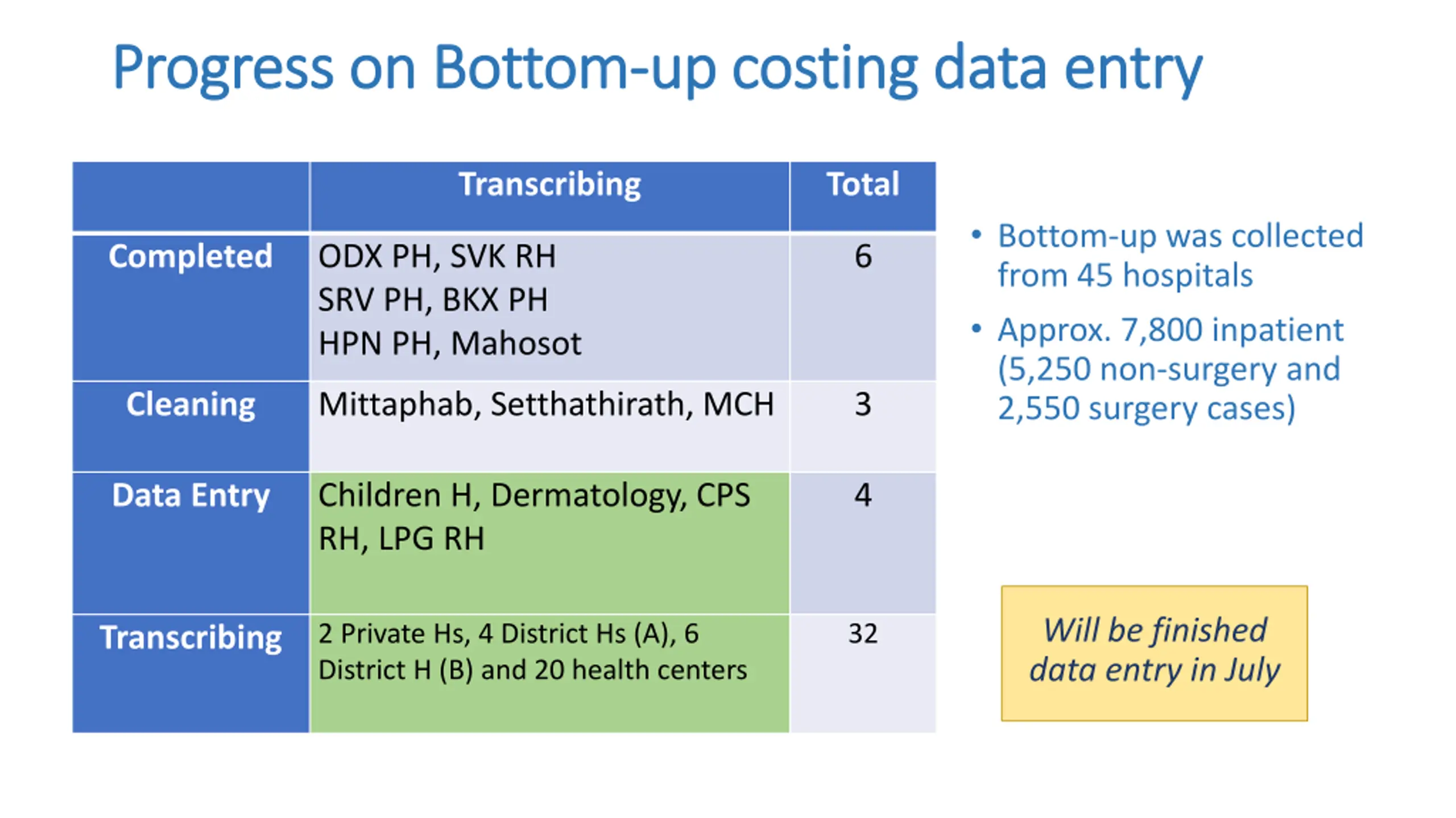 Progress on Bottom Progress on Bottom- -up costing data entry up costing data entry Transcribing Total Bottom-up was collected from 45 hospitals Approx. 7,800 inpatient (5,250 non-surgery and 2,550 surgery cases) Completed ODX PH, SVK RH SRV PH, BKX PH HPN PH, Mahosot 6 Cleaning Mittaphab, Setthathirath, MCH 3 Data Entry Children H, Dermatology, CPS RH, LPG RH 4 Will be finished data entry in July 2 Private Hs, 4 District Hs (A), 6 District H (B) and 20 health centers 32 Transcribing