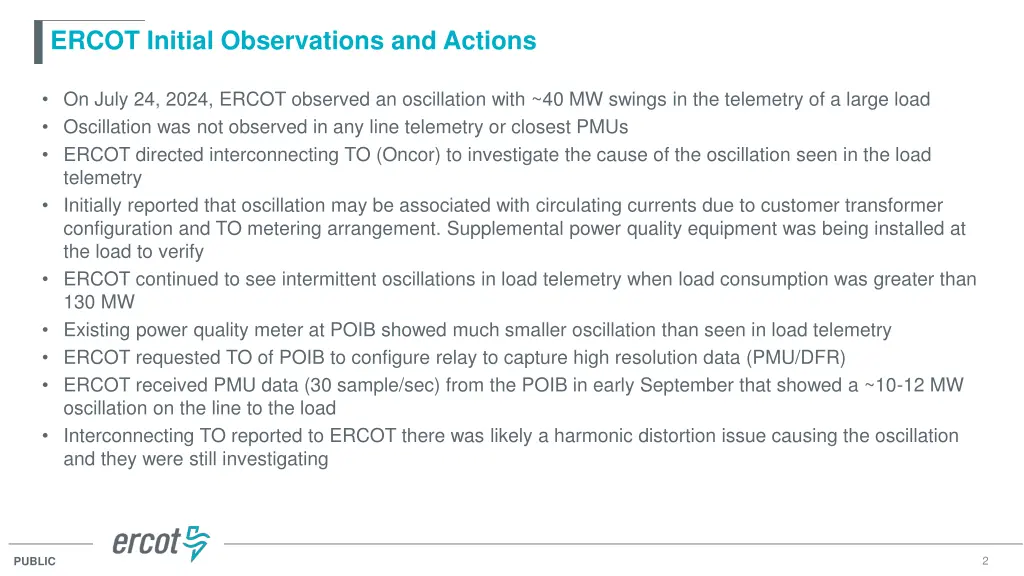 ERCOT Initial Observations and Actions On July 24, 2024, ERCOT observed an oscillation with ~40 MW swings in the telemetry of a large load Oscillation was not observed in any line telemetry or closest PMUs ERCOT directed interconnecting TO (Oncor) to investigate the cause of the oscillation seen in the load telemetry Initially reported that oscillation may be associated with circulating currents due to customer transformer configuration and TO metering arrangement. Supplemental power quality equipment was being installed at the load to verify ERCOT continued to see intermittent oscillations in load telemetry when load consumption was greater than 130 MW Existing power quality meter at POIB showed much smaller oscillation than seen in load telemetry ERCOT requested TO of POIB to configure relay to capture high resolution data (PMU/DFR) ERCOT received PMU data (30 sample/sec) from the POIB in early September that showed a ~10-12 MW oscillation on the line to the load Interconnecting TO reported to ERCOT there was likely a harmonic distortion issue causing the oscillation and they were still investigating 2 PUBLIC
