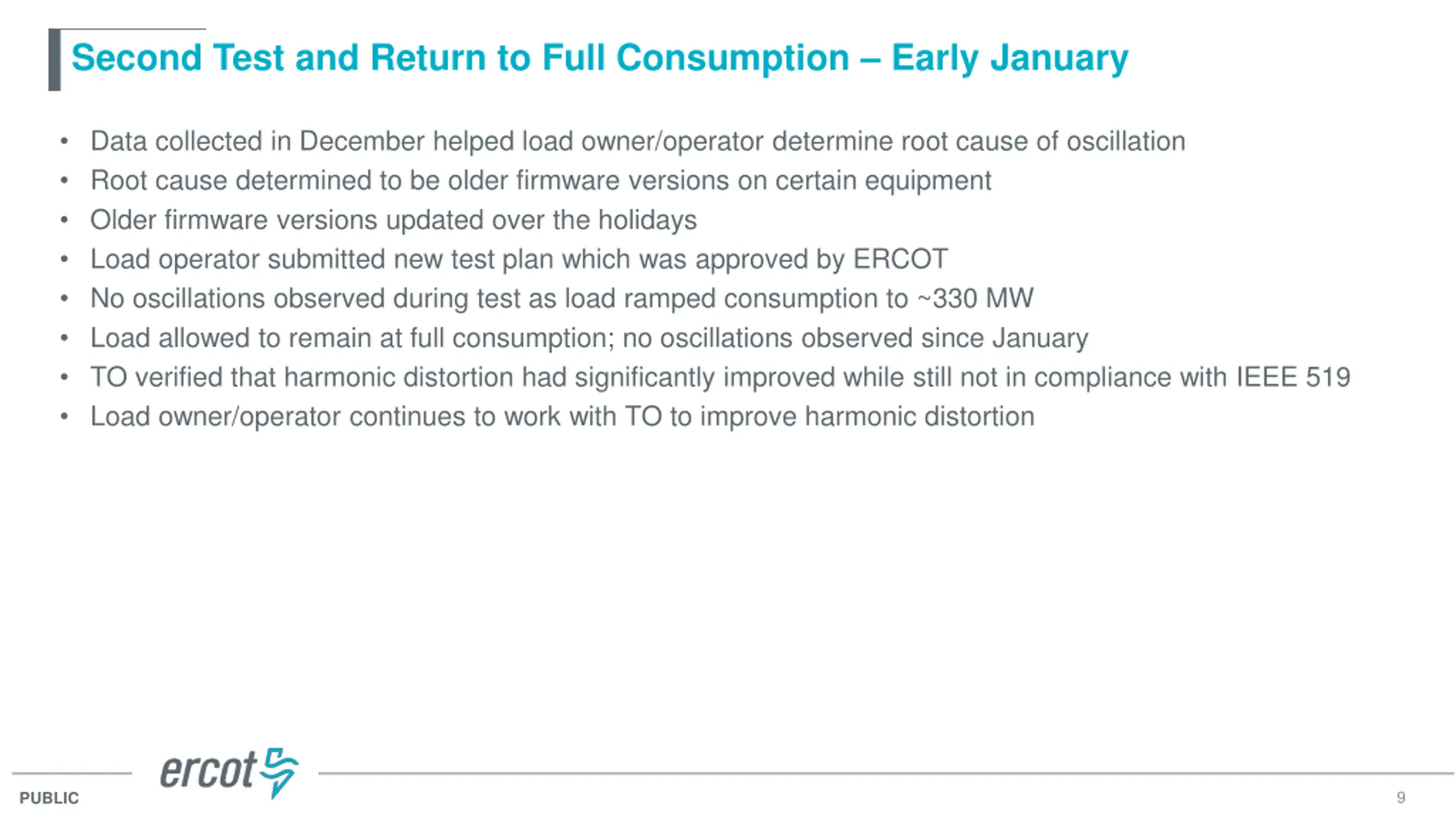 Initial Test Mid December Load owner and operator developed test plan to help determine root cause of oscillation Test plan involved increasing load consumption in 2 MW intervals while collecting data ERCOT approved test plan and coordinated with load operator to monitor for oscillations during test Oscillation was observed when load consumption increased to ~320 MW Load ramped back down to 300 MW after test 8 PUBLIC