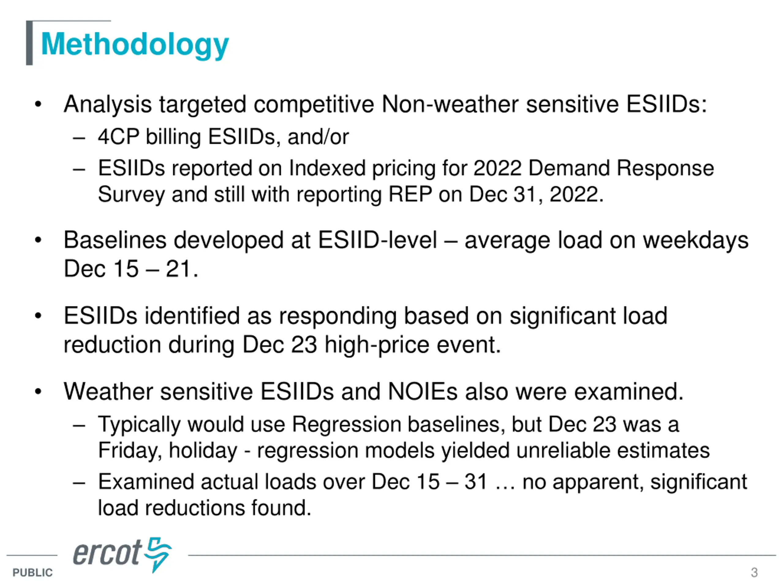 Methodology Analysis targeted competitive Non-weather sensitive ESIIDs: 4CP billing ESIIDs, and/or ESIIDs reported on Indexed pricing for 2022 Demand Response Survey and still with reporting REP on Dec 31, 2022. Baselines developed at ESIID-level average load on weekdays Dec 15 21. ESIIDs identified as responding based on significant load reduction during Dec 23 high-price event. Weather sensitive ESIIDs and NOIEs also were examined. Typically would use Regression baselines, but Dec 23 was a Friday, holiday - regression models yielded unreliable estimates Examined actual loads over Dec 15 31 no apparent, significant load reductions found. 3 PUBLIC