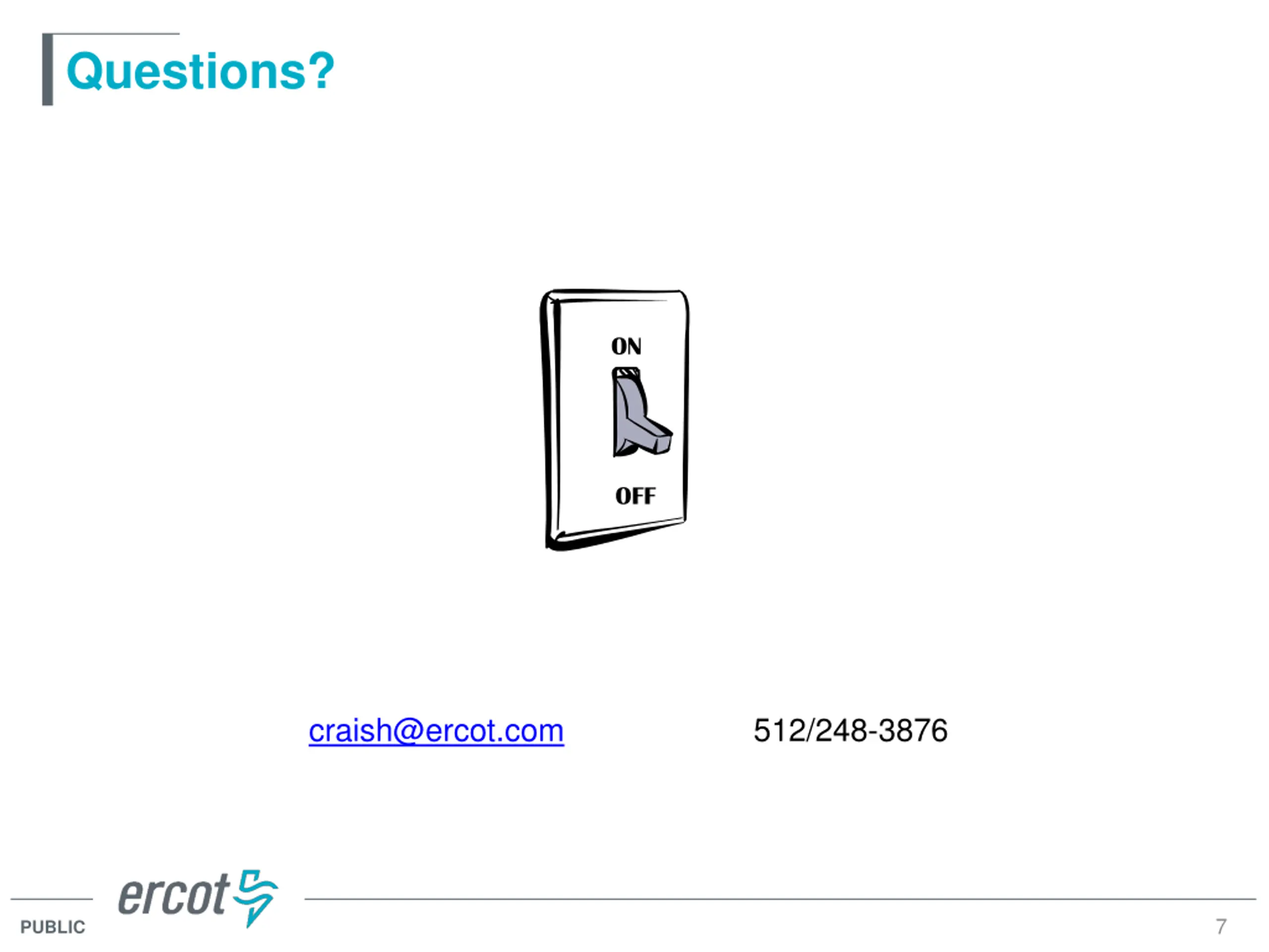 Questions? ON OFF craish@ercot.com 512/248-3876 7 PUBLIC