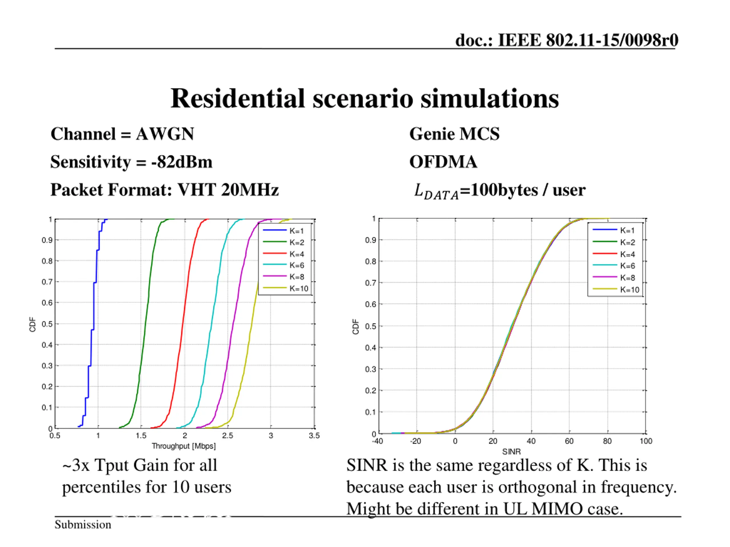 doc.: IEEE 802.11-15/0098r0 Residential scenario simulations Channel = AWGN Sensitivity = -82dBm Packet Format: VHT 20MHz Genie MCS OFDMA ?????=100bytes / user 1 1 K=1 K=2 K=4 K=6 K=8 K=10 K=1 K=2 K=4 K=6 K=8 K=10 0.9 0.9 0.8 0.8 0.7 0.7 0.6 0.6 CDF CDF 0.5 0.5 0.4 0.4 0.3 0.3 0.2 0.2 0.1 0.1 0 0 0.5 1 1.5 2 2.5 3 3.5 -40 -20 0 20 40 60 80 100 Throughput [Mbps] SINR ~3x Tput Gain for all percentiles for 10 users SINR is the same regardless of K. This is because each user is orthogonal in frequency. Might be different in UL MIMO case. 100 Byte per user Submission