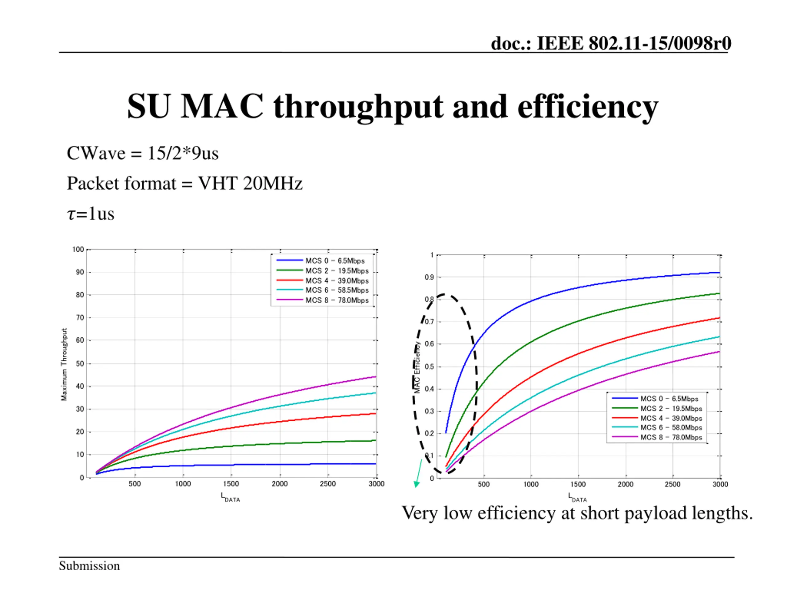 doc.: IEEE 802.11-15/0098r0 SU MAC throughput and efficiency CWave = 15/2*9us Packet format = VHT 20MHz ?=1us 100 1 MCS 0 - 6.5Mbps MCS 2 - 19.5Mbps MCS 4 - 39.0Mbps MCS 6 - 58.5Mbps MCS 8 - 78.0Mbps 90 0.9 80 0.8 70 0.7 Maximum Throughput 60 0.6 MAC Efficiency 50 0.5 40 0.4 MCS 0 - 6.5Mbps MCS 2 - 19.5Mbps MCS 4 - 39.0Mbps MCS 6 - 58.0Mbps MCS 8 - 78.0Mbps 30 0.3 20 0.2 10 0.1 0 0 500 1000 1500 LDATA 2000 2500 3000 500 1000 1500 LDATA 2000 2500 3000 Very low efficiency at short payload lengths. Submission