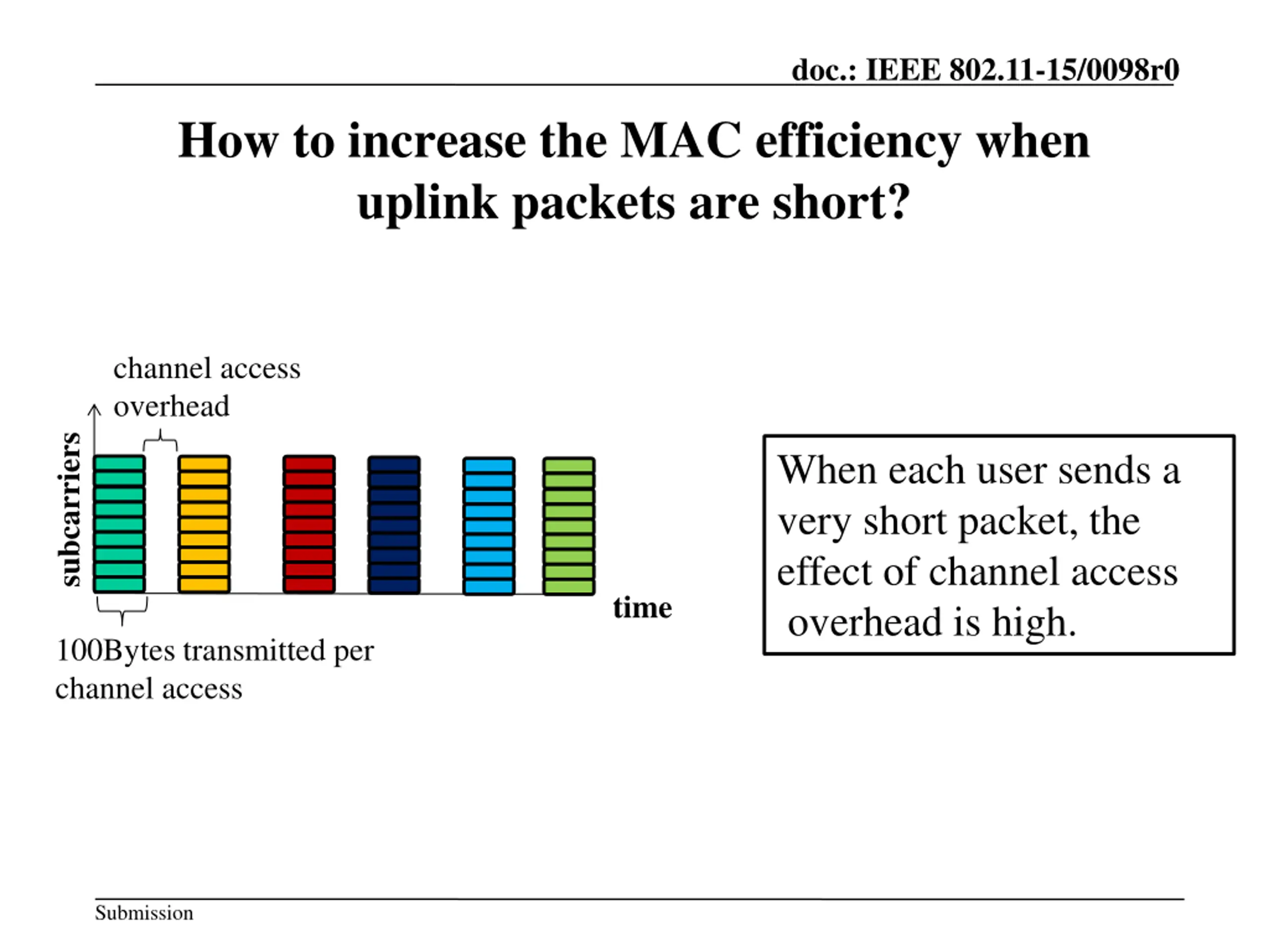 doc.: IEEE 802.11-15/0098r0 How to increase the MAC efficiency when uplink packets are short? channel access overhead subcarriers When each user sends a very short packet, the effect of channel access overhead is high. time 100Bytes transmitted per channel access Submission