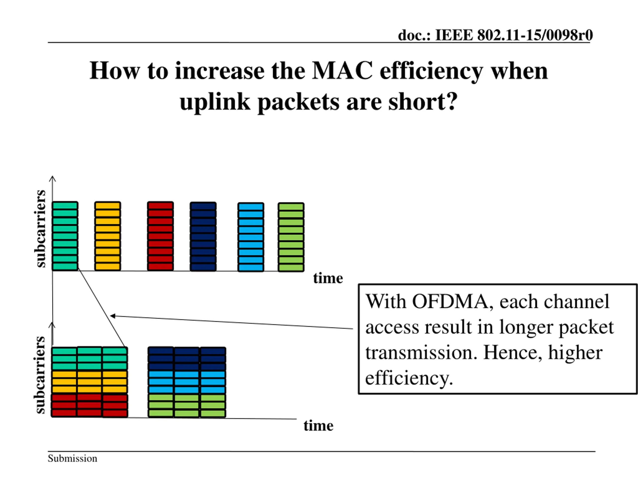 doc.: IEEE 802.11-15/0098r0 How to increase the MAC efficiency when uplink packets are short? subcarriers time With OFDMA, each channel access result in longer packet transmission. Hence, higher efficiency. subcarriers time Submission