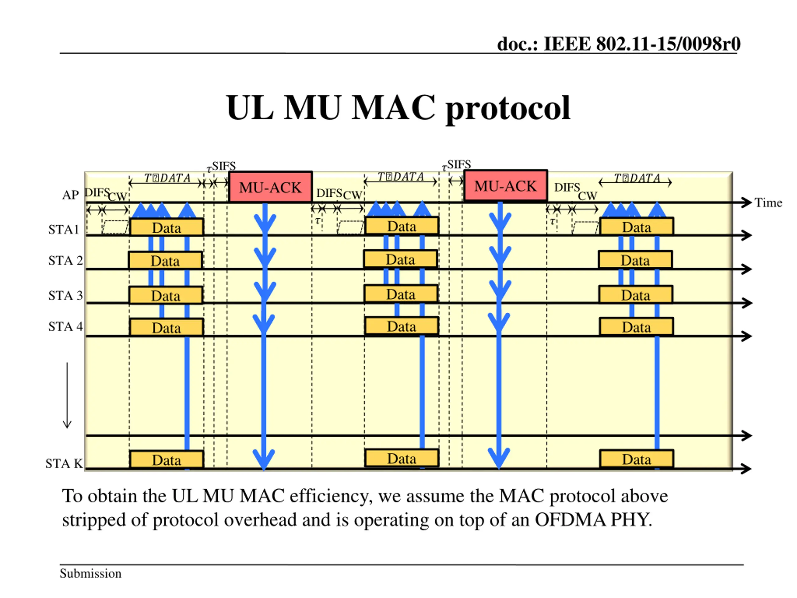 doc.: IEEE 802.11-15/0098r0 UL MU MAC protocol SIFS SIFS ? ? ? ???? ? ???? ? ???? MU-ACK MU-ACK DIFS DIFSCW DIFS AP CW CW Time ? ? Data Data Data STA1 Data Data Data STA 2 Data Data Data STA 3 Data Data STA 4 Data Data Data Data STA K To obtain the UL MU MAC efficiency, we assume the MAC protocol above stripped of protocol overhead and is operating on top of an OFDMA PHY. Submission