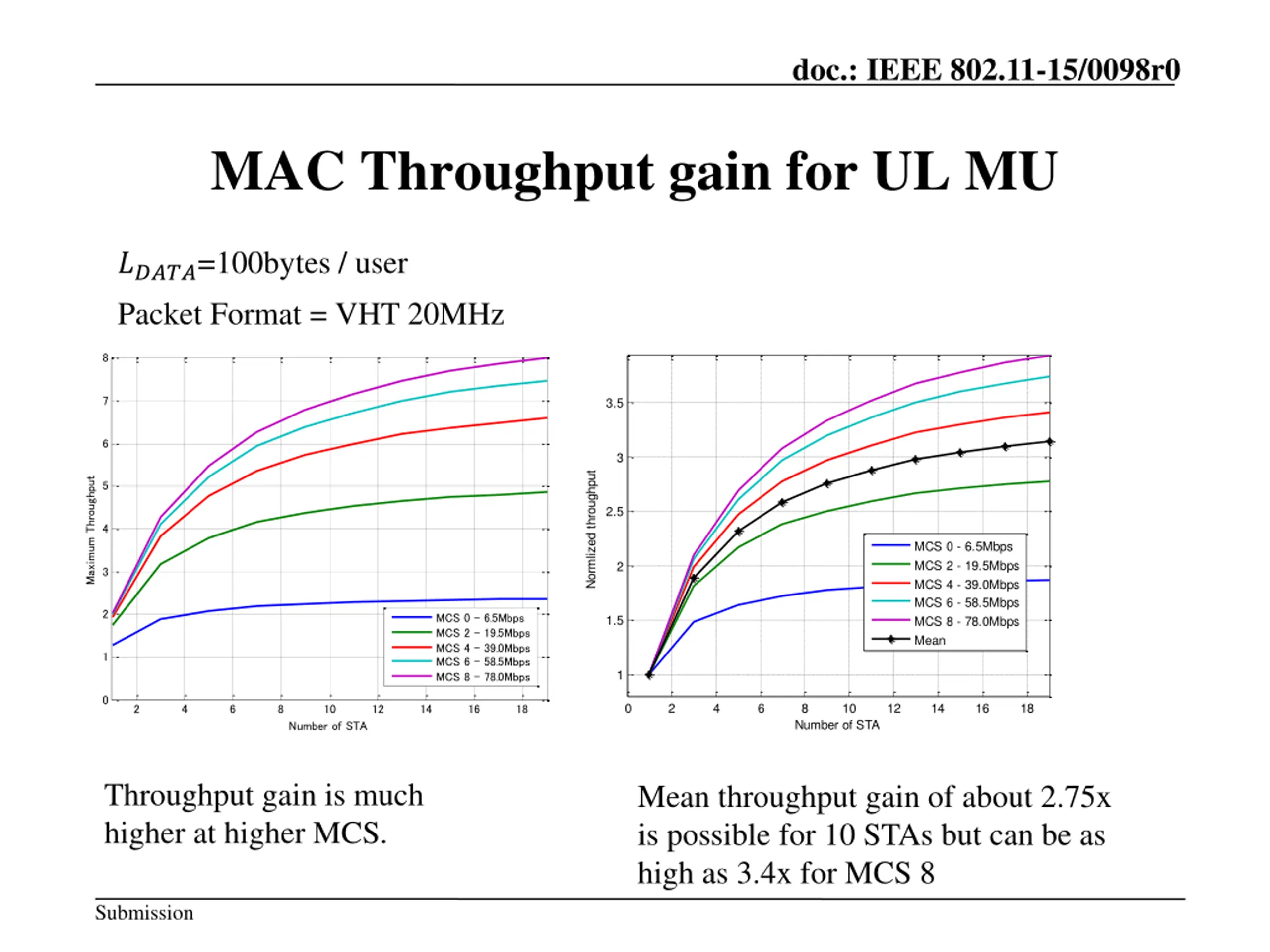 doc.: IEEE 802.11-15/0098r0 MAC Throughput gain for UL MU ?????=100bytes / user Packet Format = VHT 20MHz 8 7 3.5 6 3 Normlized throughput Maximum Throughput 5 2.5 4 MCS 0 - 6.5Mbps MCS 2 - 19.5Mbps MCS 4 - 39.0Mbps MCS 6 - 58.5Mbps MCS 8 - 78.0Mbps Mean 2 3 2 MCS 0 - 6.5Mbps MCS 2 - 19.5Mbps MCS 4 - 39.0Mbps MCS 6 - 58.5Mbps MCS 8 - 78.0Mbps 1.5 1 1 0 0 2 4 6 8 10 12 14 16 18 2 4 6 8 10 12 14 16 18 Number of STA Number of STA Throughput gain is much higher at higher MCS. Mean throughput gain of about 2.75x is possible for 10 STAs but can be as high as 3.4x for MCS 8 Submission