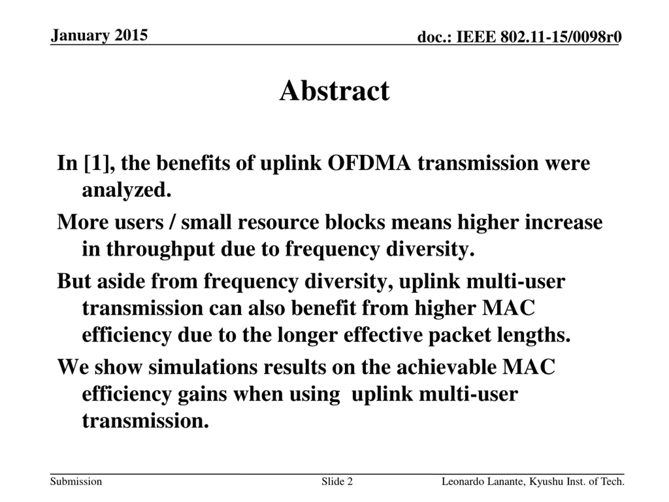 January 2015 doc.: IEEE 802.11-15/0098r0 Abstract In [1], the benefits of uplink OFDMA transmission were analyzed. More users / small resource blocks means higher increase in throughput due to frequency diversity. But aside from frequency diversity, uplink multi-user transmission can also benefit from higher MAC efficiency due to the longer effective packet lengths. We show simulations results on the achievable MAC efficiency gains when using uplink multi-user transmission. Submission Slide 2 Leonardo Lanante, Kyushu Inst. of Tech.