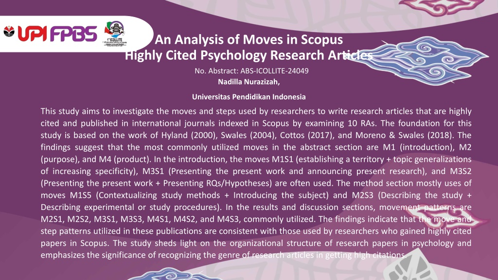 An Analysis of Moves in Scopus Highly Cited Psychology Research Articles No. Abstract: ABS-ICOLLITE-24049 Nadilla Nurazizah, Universitas Pendidikan Indonesia This study aims to investigate the moves and steps used by researchers to write research articles that are highly cited and published in international journals indexed in Scopus by examining 10 RAs. The foundation for this study is based on the work of Hyland (2000), Swales (2004), Cottos (2017), and Moreno & Swales (2018). The findings suggest that the most commonly utilized moves in the abstract section are M1 (introduction), M2 (purpose), and M4 (product). In the introduction, the moves M1S1 (establishing a territory + topic generalizations of increasing specificity), M3S1 (Presenting the present work and announcing present research), and M3S2 (Presenting the present work + Presenting RQs/Hypotheses) are often used. The method section mostly uses of moves M1S5 (Contextualizing study methods + Introducing the subject) and M2S3 (Describing the study + Describing experimental or study procedures). In the results and discussion sections, movement patterns are M2S1, M2S2, M3S1, M3S3, M4S1, M4S2, and M4S3, commonly utilized. The findings indicate that the move and step patterns utilized in these publications are consistent with those used by researchers who gained highly cited papers in Scopus. The study sheds light on the organizational structure of research papers in psychology and emphasizes the significance of recognizing the genre of research articles in getting high citations.