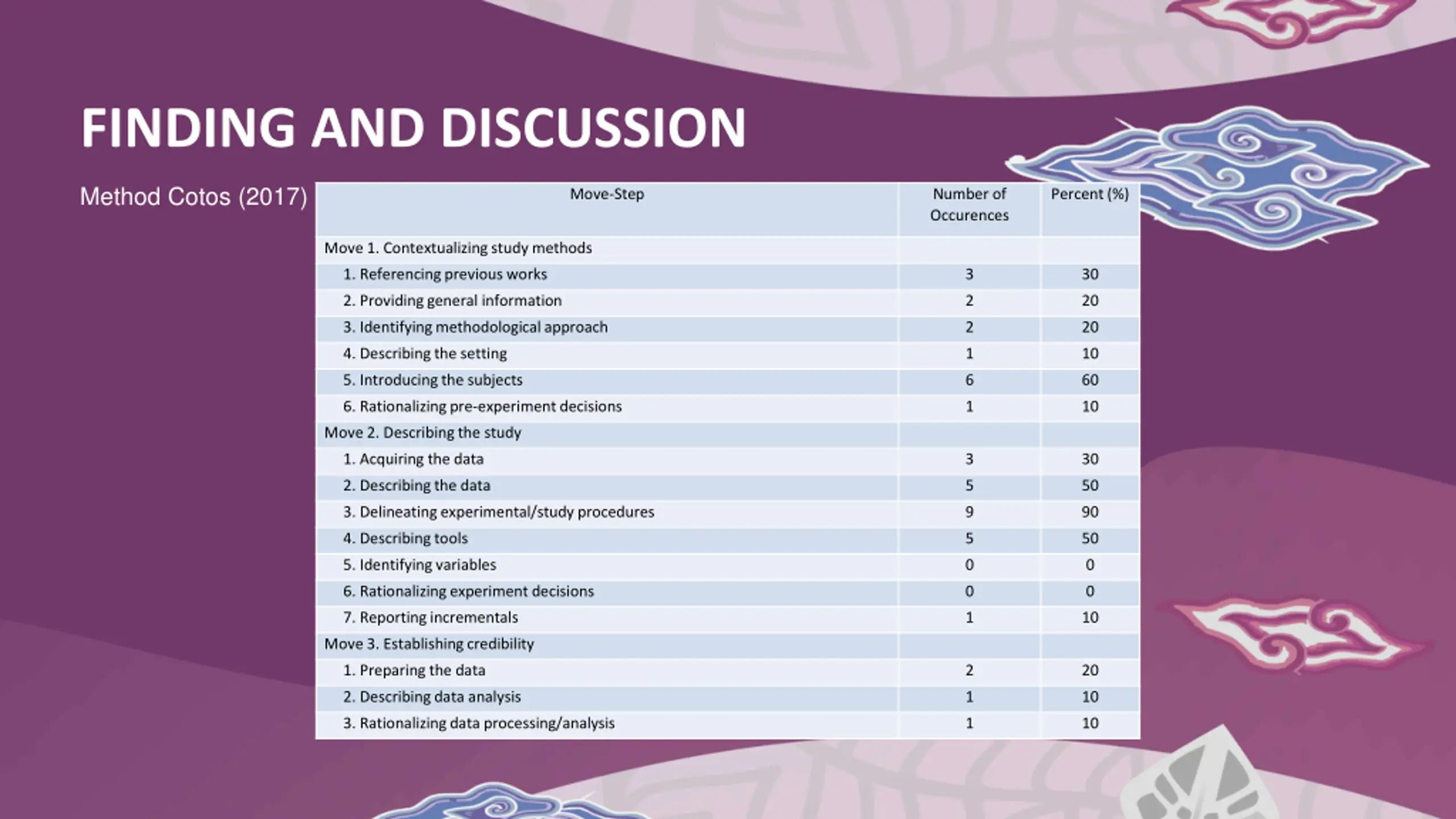 FINDING AND DISCUSSION Method Cotos (2017) Move-Step Number of Occurences Percent (%) Move 1. Contextualizing study methods 1. Referencing previous works 3 30 2. Providing general information 2 20 3. Identifying methodological approach 2 20 4. Describing the setting 1 10 5. Introducing the subjects 6 60 6. Rationalizing pre-experiment decisions 1 10 Move 2. Describing the study 1. Acquiring the data 3 30 2. Describing the data 5 50 3. Delineating experimental/study procedures 9 90 4. Describing tools 5 50 5. Identifying variables 0 0 6. Rationalizing experiment decisions 0 0 7. Reporting incrementals 1 10 Move 3. Establishing credibility 1. Preparing the data 2 20 2. Describing data analysis 1 10 3. Rationalizing data processing/analysis 1 10
