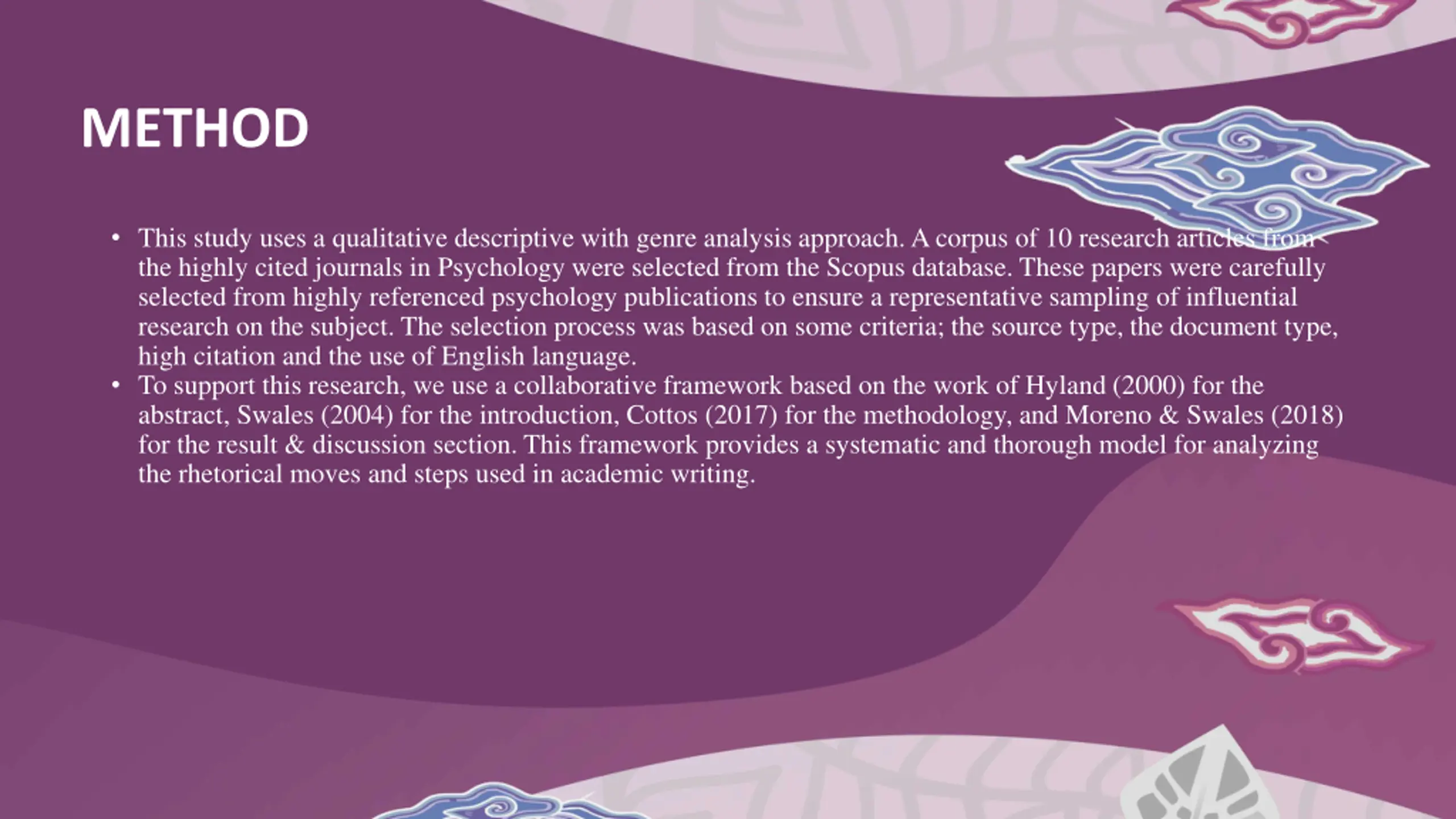 METHOD This study uses a qualitative descriptive with genre analysis approach. A corpus of 10 research articles from the highly cited journals in Psychology were selected from the Scopus database. These papers were carefully selected from highly referenced psychology publications to ensure a representative sampling of influential research on the subject. The selection process was based on some criteria; the source type, the document type, high citation and the use of English language. To support this research, we use a collaborative framework based on the work of Hyland (2000) for the abstract, Swales (2004) for the introduction, Cottos (2017) for the methodology, and Moreno & Swales (2018) for the result & discussion section. This framework provides a systematic and thorough model for analyzing the rhetorical moves and steps used in academic writing.