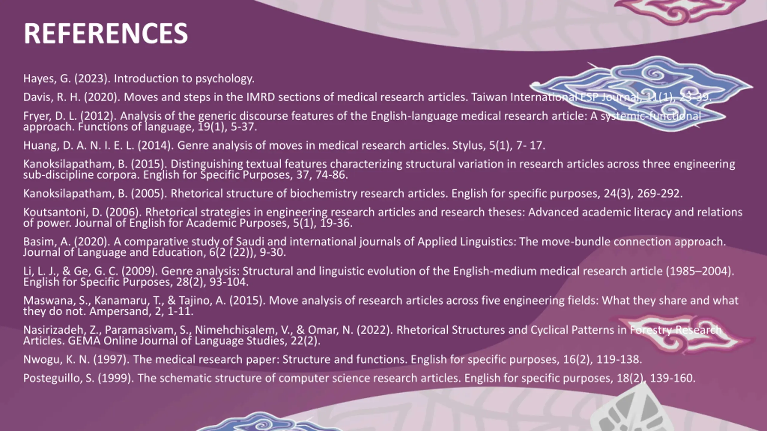 REFERENCES Hayes, G. (2023). Introduction to psychology. Davis, R. H. (2020). Moves and steps in the IMRD sections of medical research articles. Taiwan International ESP Journal, 11(1), 23-39. Fryer, D. L. (2012). Analysis of the generic discourse features of the English-language medical research article: A systemic-functional approach. Functions of language, 19(1), 5-37. Huang, D. A. N. I. E. L. (2014). Genre analysis of moves in medical research articles. Stylus, 5(1), 7- 17. Kanoksilapatham, B. (2015). Distinguishing textual features characterizing structural variation in research articles across three engineering sub-discipline corpora. English for Specific Purposes, 37, 74-86. Kanoksilapatham, B. (2005). Rhetorical structure of biochemistry research articles. English for specific purposes, 24(3), 269-292. Koutsantoni, D. (2006). Rhetorical strategies in engineering research articles and research theses: Advanced academic literacy and relations of power. Journal of English for Academic Purposes, 5(1), 19-36. Basim, A. (2020). A comparative study of Saudi and international journals of Applied Linguistics: The move-bundle connection approach. Journal of Language and Education, 6(2 (22)), 9-30. Li, L. J., & Ge, G. C. (2009). Genre analysis: Structural and linguistic evolution of the English-medium medical research article (1985 2004). English for Specific Purposes, 28(2), 93-104. Maswana, S., Kanamaru, T., & Tajino, A. (2015). Move analysis of research articles across five engineering fields: What they share and what they do not. Ampersand, 2, 1-11. Nasirizadeh, Z., Paramasivam, S., Nimehchisalem, V., & Omar, N. (2022). Rhetorical Structures and Cyclical Patterns in Forestry Research Articles. GEMA Online Journal of Language Studies, 22(2). Nwogu, K. N. (1997). The medical research paper: Structure and functions. English for specific purposes, 16(2), 119-138. Posteguillo, S. (1999). The schematic structure of computer science research articles. English for specific purposes, 18(2), 139-160.
