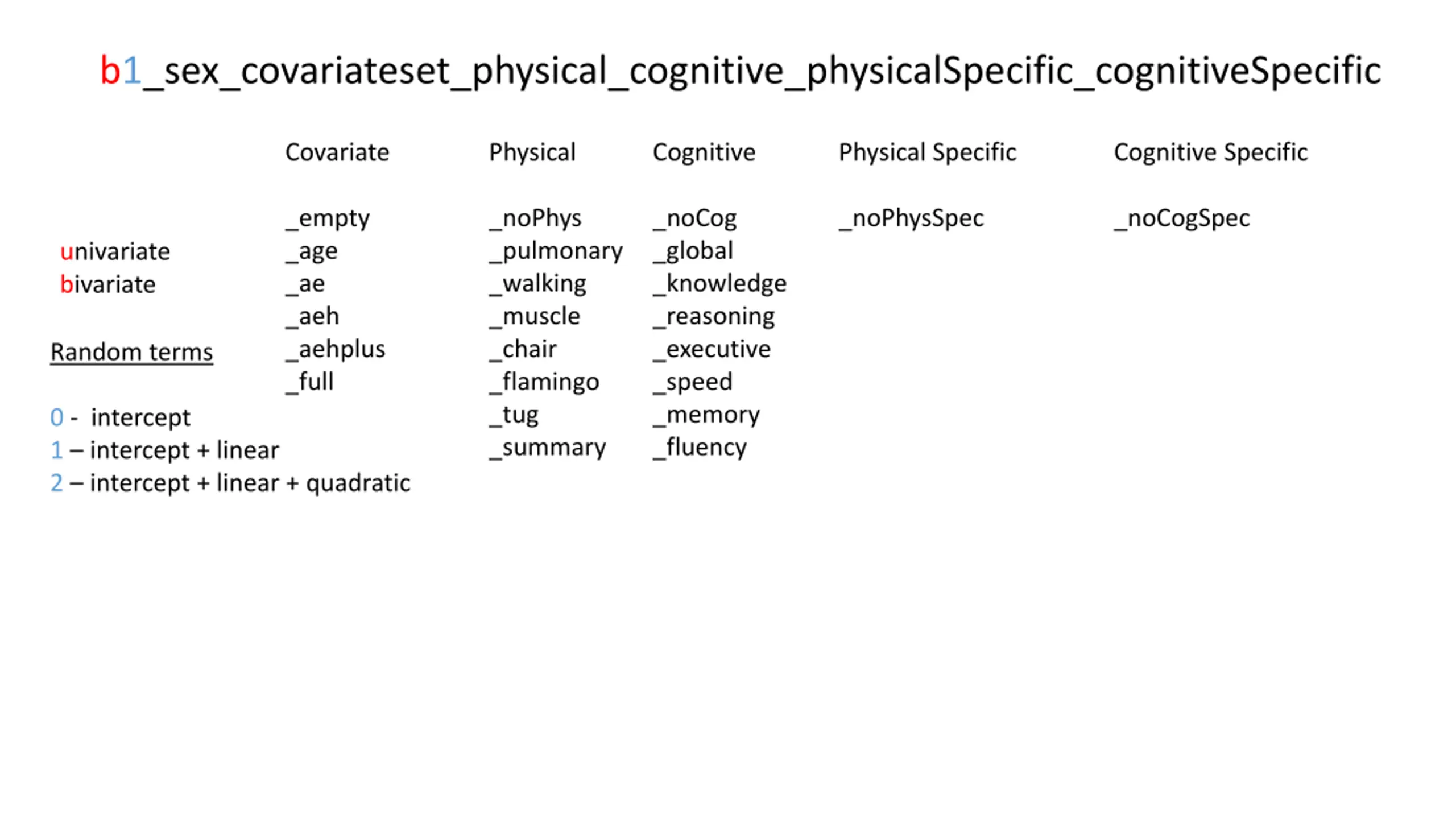 b1_sex_covariateset_physical_cognitive_physicalSpecific_cognitiveSpecificb1_sex_covariateset_physical_cognitive_physicalSpecific_cognitiveSpecific Covariate Physical Cognitive Physical Specific Cognitive Specific _empty _age _ae _aeh _aehplus _full _noPhys _pulmonary _walking _muscle _chair _flamingo _tug _summary _noCog _global _knowledge _reasoning _executive _speed _memory _fluency _noPhysSpec _noCogSpec univariate bivariate Random terms 0 - intercept 1 intercept + linear 2 intercept + linear + quadratic