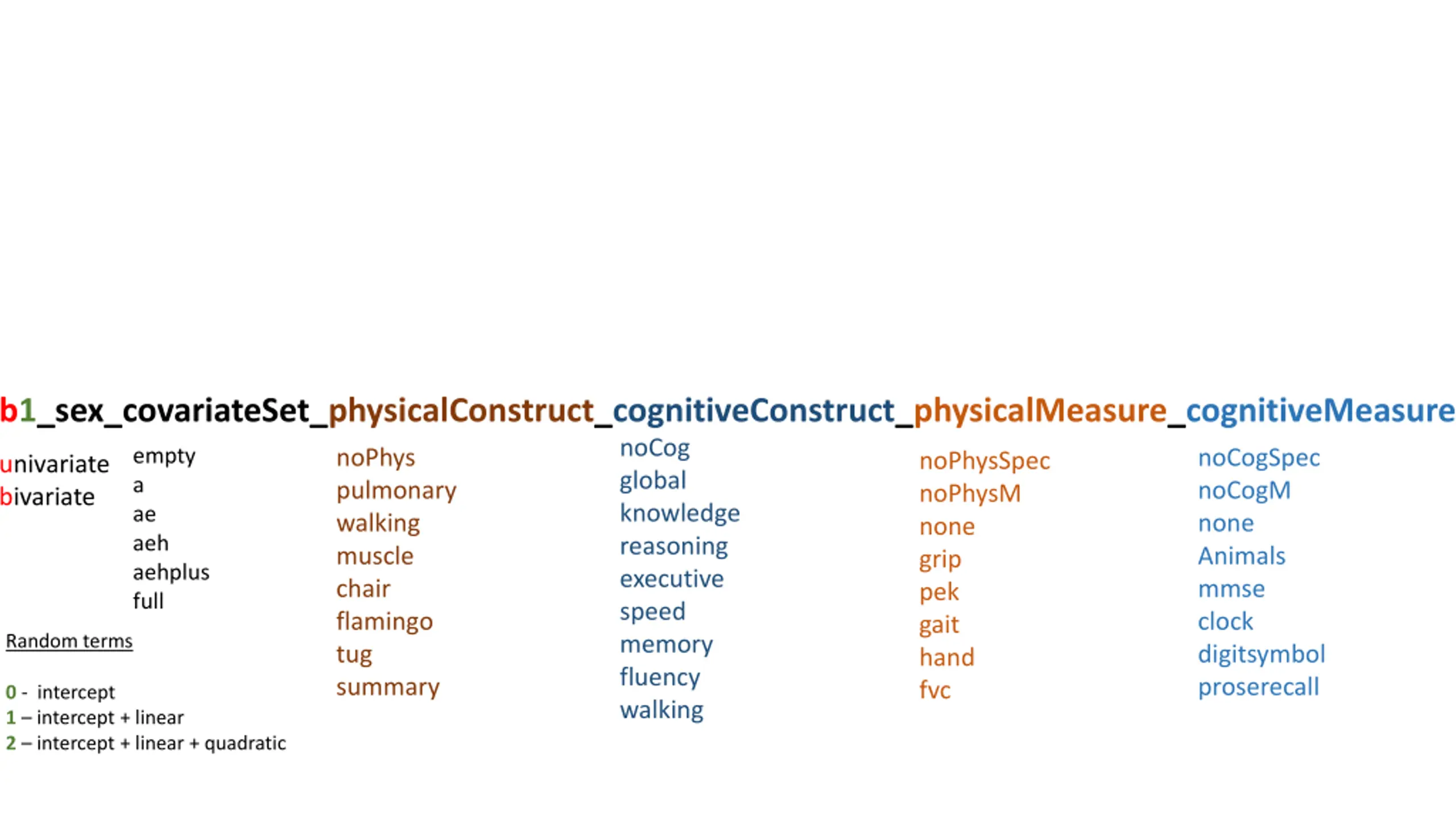 b1_sex_covariateSet_physicalConstruct_cognitiveConstruct_physicalMeasure_cognitiveMeasureb1_sex_covariateSet_physicalConstruct_cognitiveConstruct_physicalMeasure_cognitiveMeasure noCog global knowledge reasoning executive speed memory fluency walking 1 intercept + linear 2 intercept + linear + quadratic empty a ae aeh aehplus full noPhys pulmonary walking muscle chair flamingo tug summary noCogSpec noCogM none Animals mmse clock digitsymbol proserecall noPhysSpec noPhysM none grip pek gait hand fvc univariate bivariate Random terms 0 - intercept