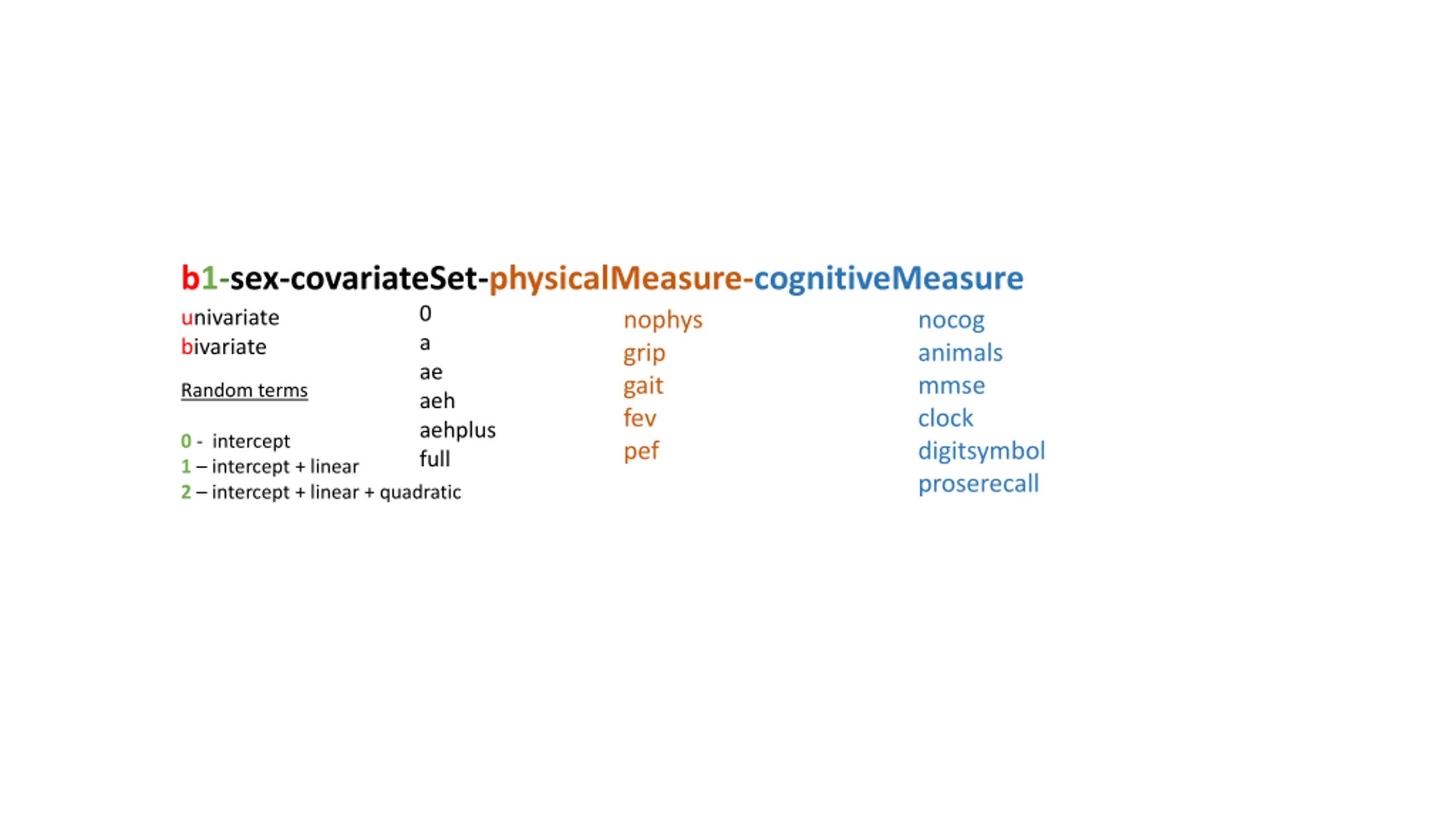 b1-sex-covariateSet-physicalMeasure-cognitiveMeasure 0 a ae aeh aehplus full 1 intercept + linear 2 intercept + linear + quadratic univariate bivariate nophys grip gait fev pef nocog animals mmse clock digitsymbol proserecall Random terms 0 - intercept