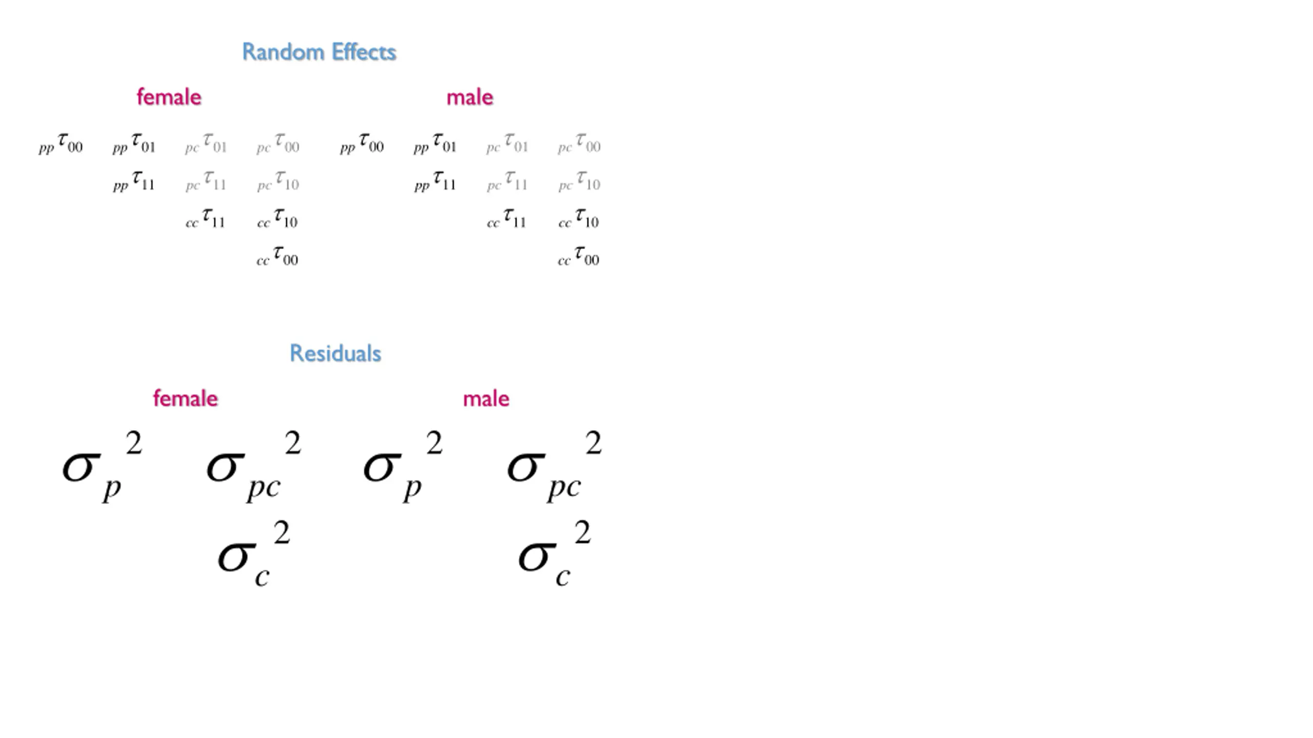 Random Effects female male 00 01 01 00 00 01 01 00 pp pp pc pc pp pp pc pc 11 11 10 11 11 10 pp p c pc pp p c pc 1 1 10 1 1 10 cc cc cc cc 00 00 cc cc Residuals female male 2 2 2 2 p pc p pc 2 2 c c